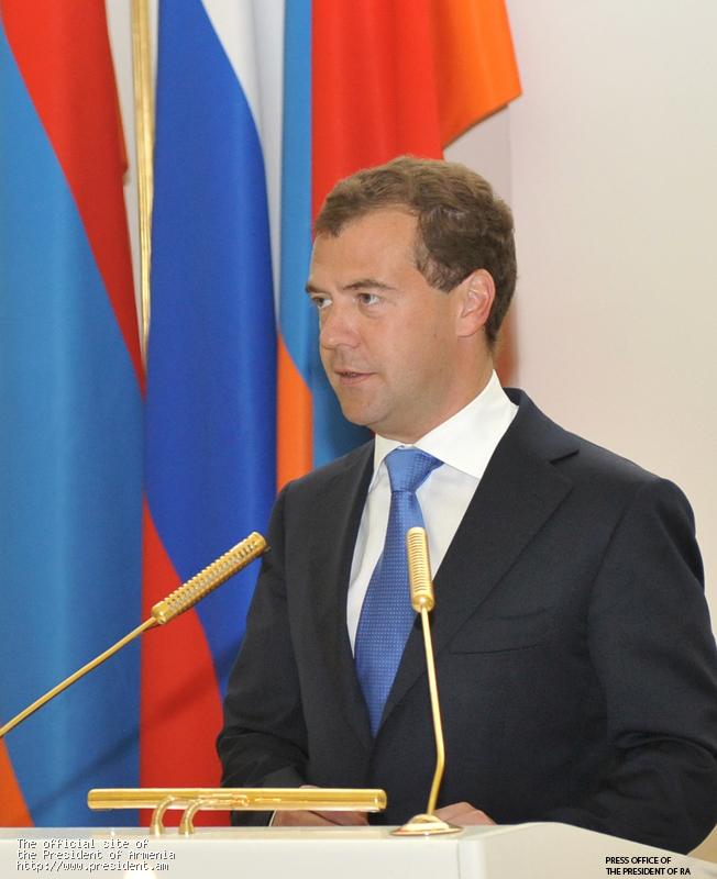 Президент РФ Дмитрий Медведев выразил благодарность Президенту Сержу Саргсяну за теплый прием и добрые слова, сказанные о Российской Федерации и российских партнерах. «Наши отношения, действительно, насчитывают века. И что самое главное, в эти труднейшие исторические этапы наши народы традиционно поддерживали друг друга. Примеров тому множество», - сказал Дмитрий Медведев.