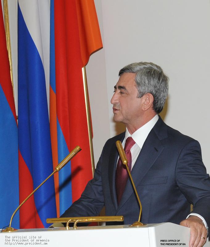 «Мы гордимся давними и прочными узами дружбы между нашими народами, многогранным и успеш¬ным сотрудничеством двух государств. Всего несколько недель назад мы с Президентом России приняли учас¬тие в праздновании 300-летия армянской общины Санкт-Петер¬бур¬га. Эта община – ровесница ска¬зоч¬ного города на Неве, наглядный пример долговеч¬ности наших отно¬ше¬ний, взаимо¬про¬ник¬новения наших народов и культур. И мы там чествовали людей, которые стали естественным мостом между нашими странами – Амбарцумяна, Орбели, Тахтаджяна», - отметил Президент РА.