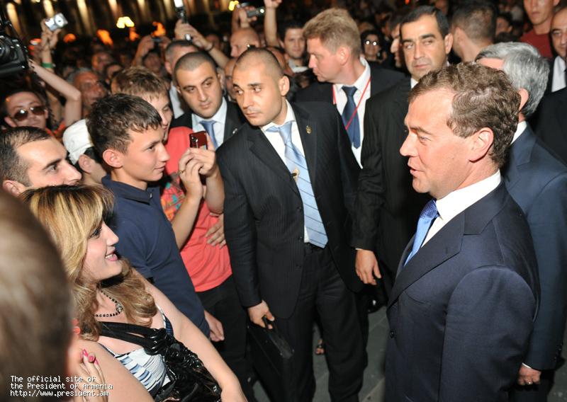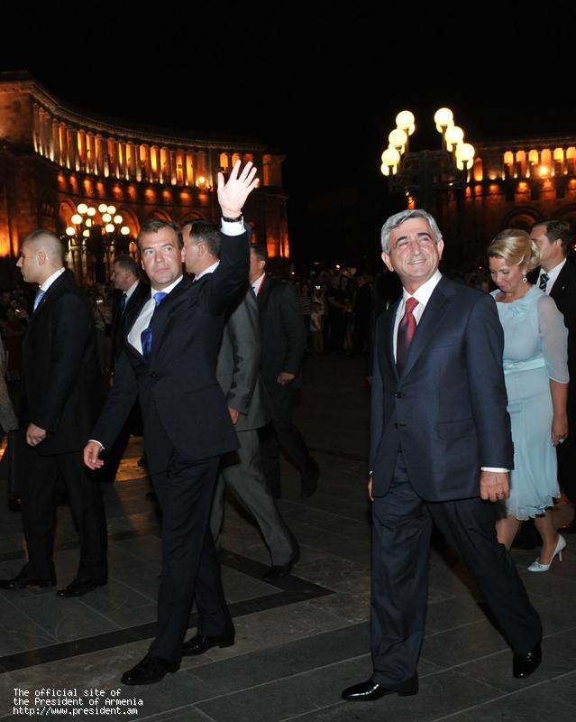 Президенты РА и РФ вечером также совершили прогулку возле «Поющих фонтанов» на Площади Республики, слушая звучащие в честь государственного визита Президента РФ произведения русских классиков. Находящиеся на Площади ереванцы приветствовали Президентов двух стран. Затем Серж Саргсян и Дмитрий Медведев посетили одно из ереванских кафе.