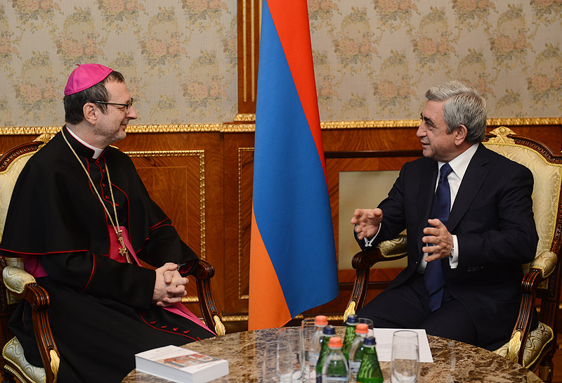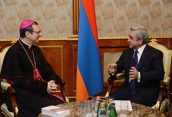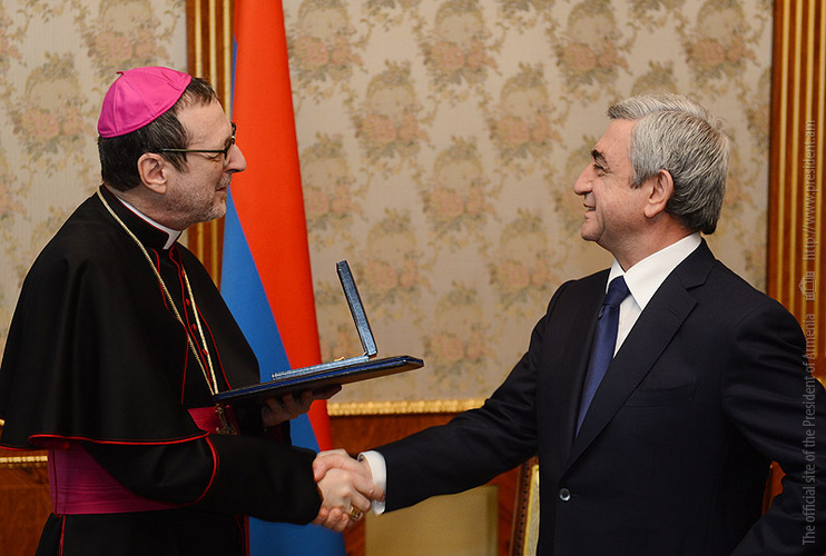 Президент Серж Саргсян сегодня принял бывшего Апостольского Нунция Святого Престола на Южном Кавказе Клаудио Гуджеротти. Президент Республики, за вклад, внесенный в дело укрепления двусторонних отношений между Арменией и Ватиканом и развития арменоведения, поздравил Клаудио Гуджеротти и вручил ему высокую государственную награду РА – медаль Мовсеса Хоренаци, которой он был награжден Президентом Сержем Саргсяном.