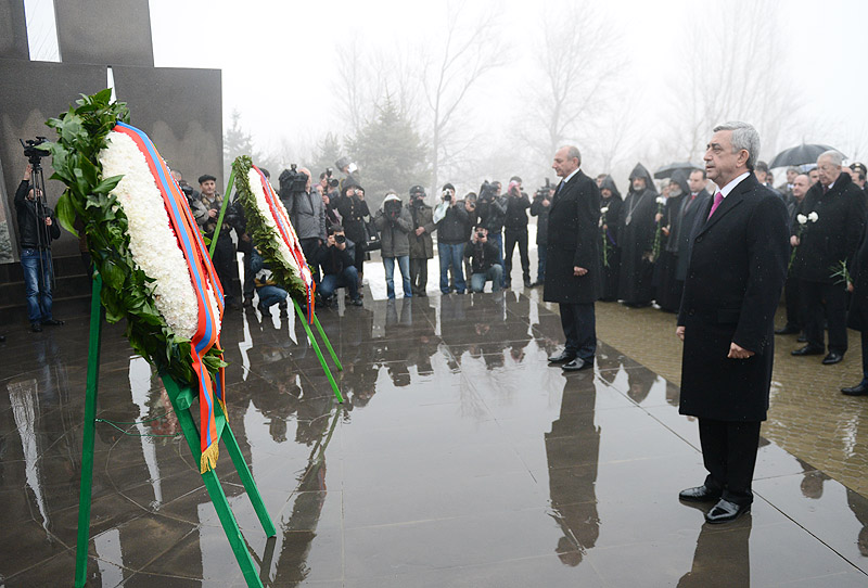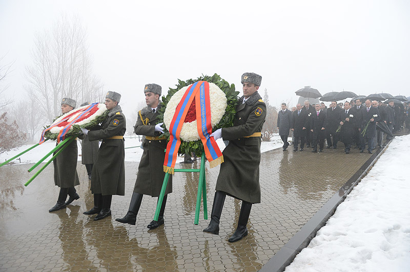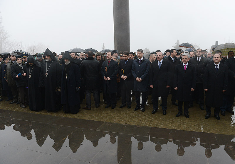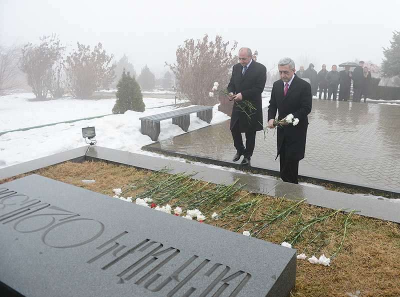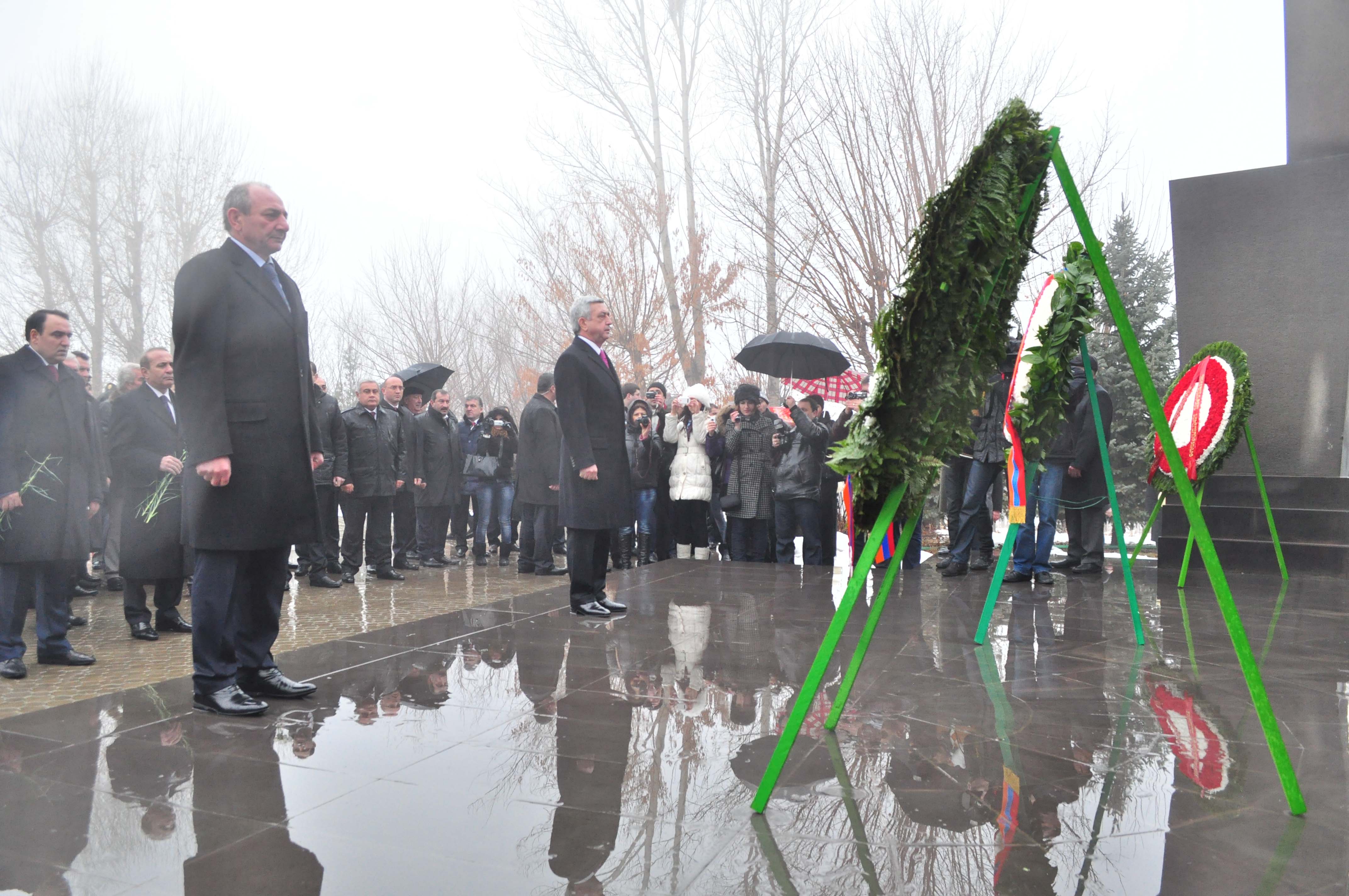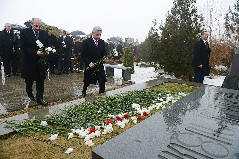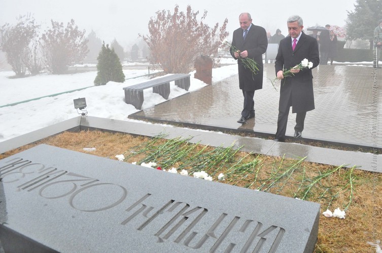 В связи с Днем Армии Президент Серж Саргсян с Президентом НКР Бако Саакяном и в сопровождении высшего руководства РА и представителей армянского духовенства сегодня посетил воинский пантеон «Ераблур» и воздал дань уважения памяти сынов Армении, пожертвовавших своими жизнями во имя независимости Родины.