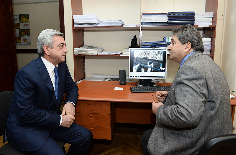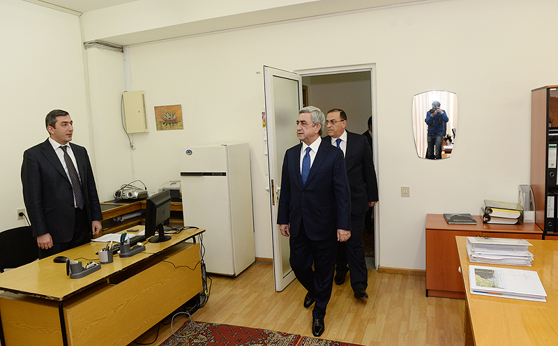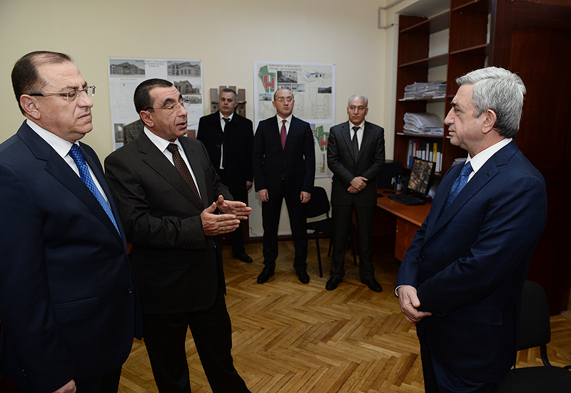 Президент Серж Саргсян сегодня посетил Министерство градостроительства. Президент Республики обошел ряд подразделений министерства, ознакомился с условиями работы, поинтересовался предстоящими программами и имеющимися проблемами, побеседовал с сотрудниками об осуществляемых работах. В частности, в управлении градостроительной политики и пространственного планирования Президенту представили электронную систему разрешений на застройку и ее преимущества. В управлении жилищной политики и коммунальных инфраструктур Серж Саргсян ознакомился с работами по жилищному строительству, осуществляемыми в зоне бедствия при государственной поддержке. Президент Республики посетил также государственное учреждение «Офис по реализации градостроительных программ», где Президенту представили процесс контроля государственных строительных работ посредством сетевой системы и электронную систему организации строительных конкурсов.