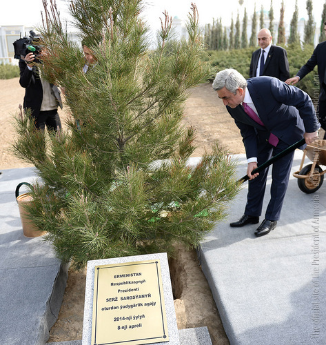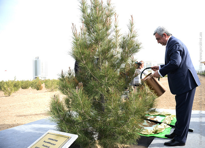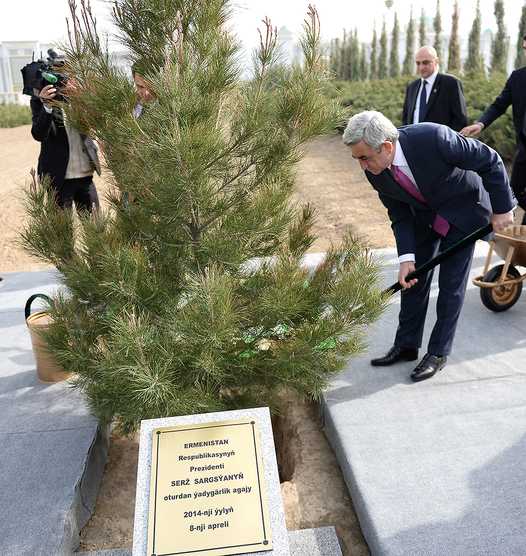 Находящийся с официальным визитом в Туркменистане Президент Серж Саргсян сегодня посетил находящийся в селении Кипчак мавзолей Первого Президента независимого Туркменистана Сапармурата Ниязова (Туркменбаши), мечеть и Монумент Конституции Туркменистана. Президент Армении возложил венки в мавзолее Туркменбаши и к Монументу Конституции, воздал дань уважения. Серж Саргсян также посадил дерево на аллее почетных гостей у Монумента Конституции.