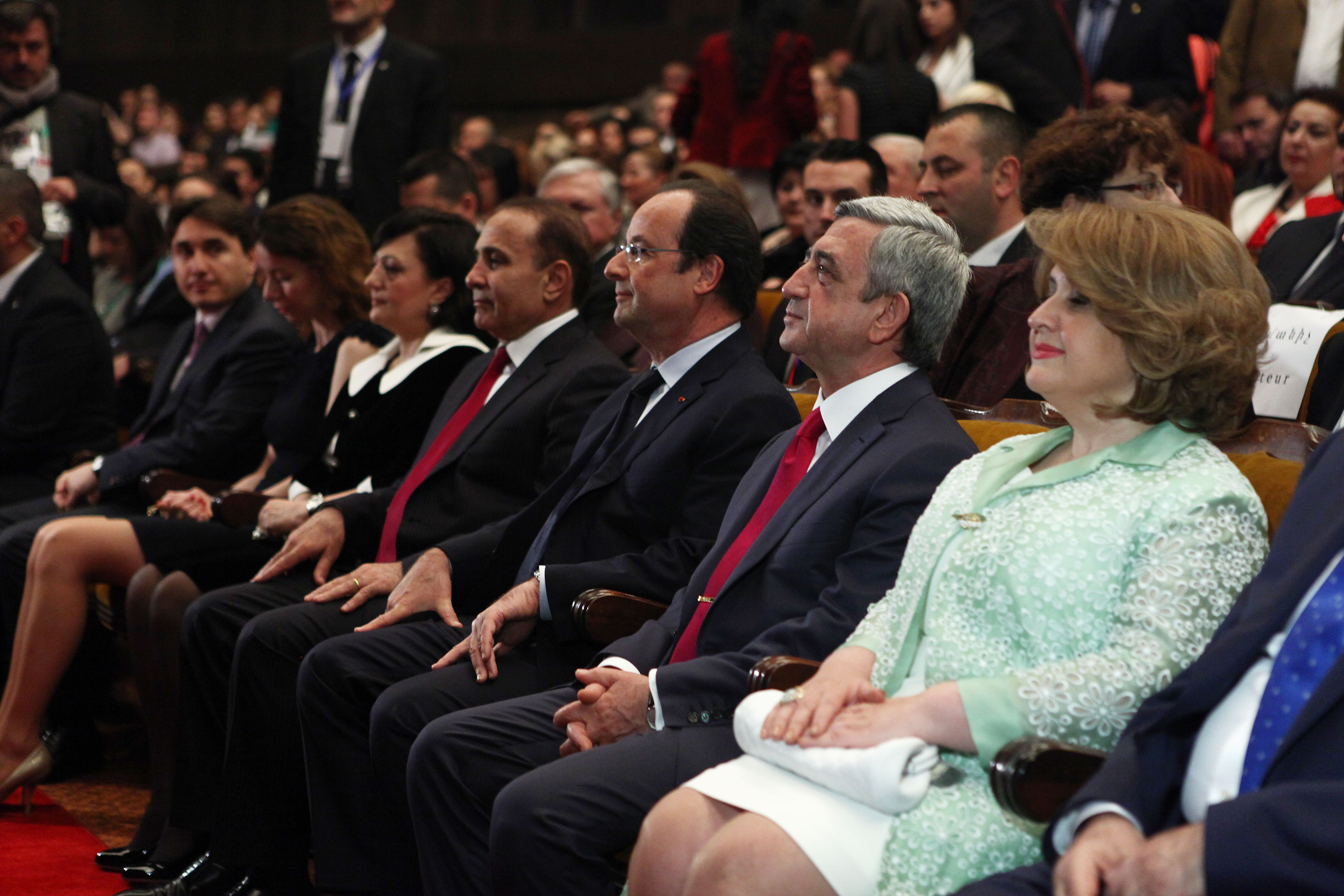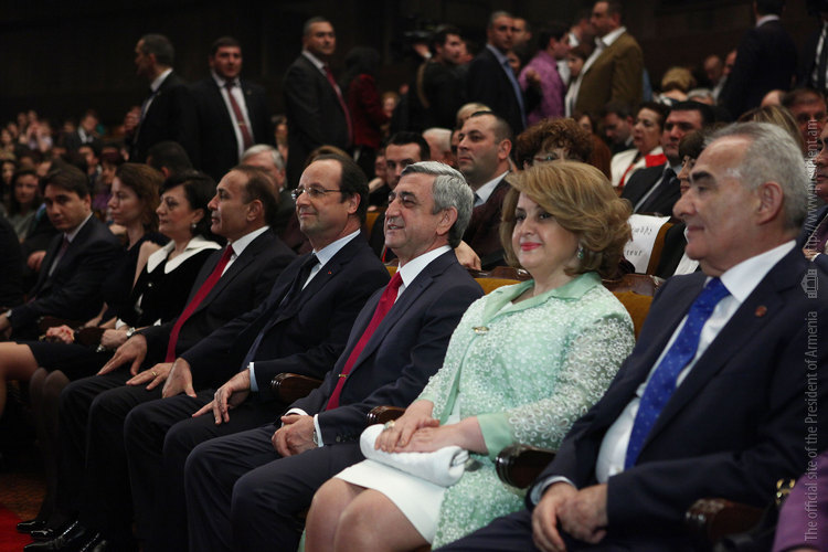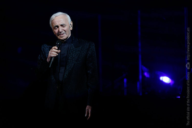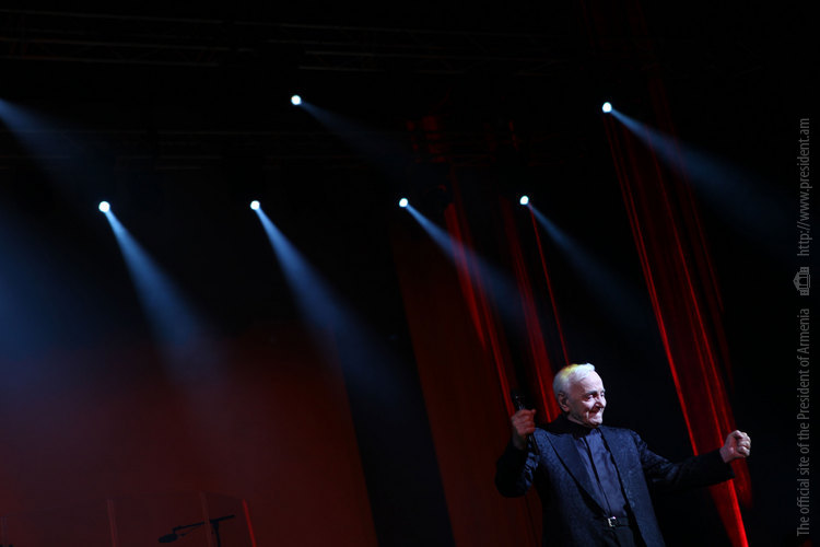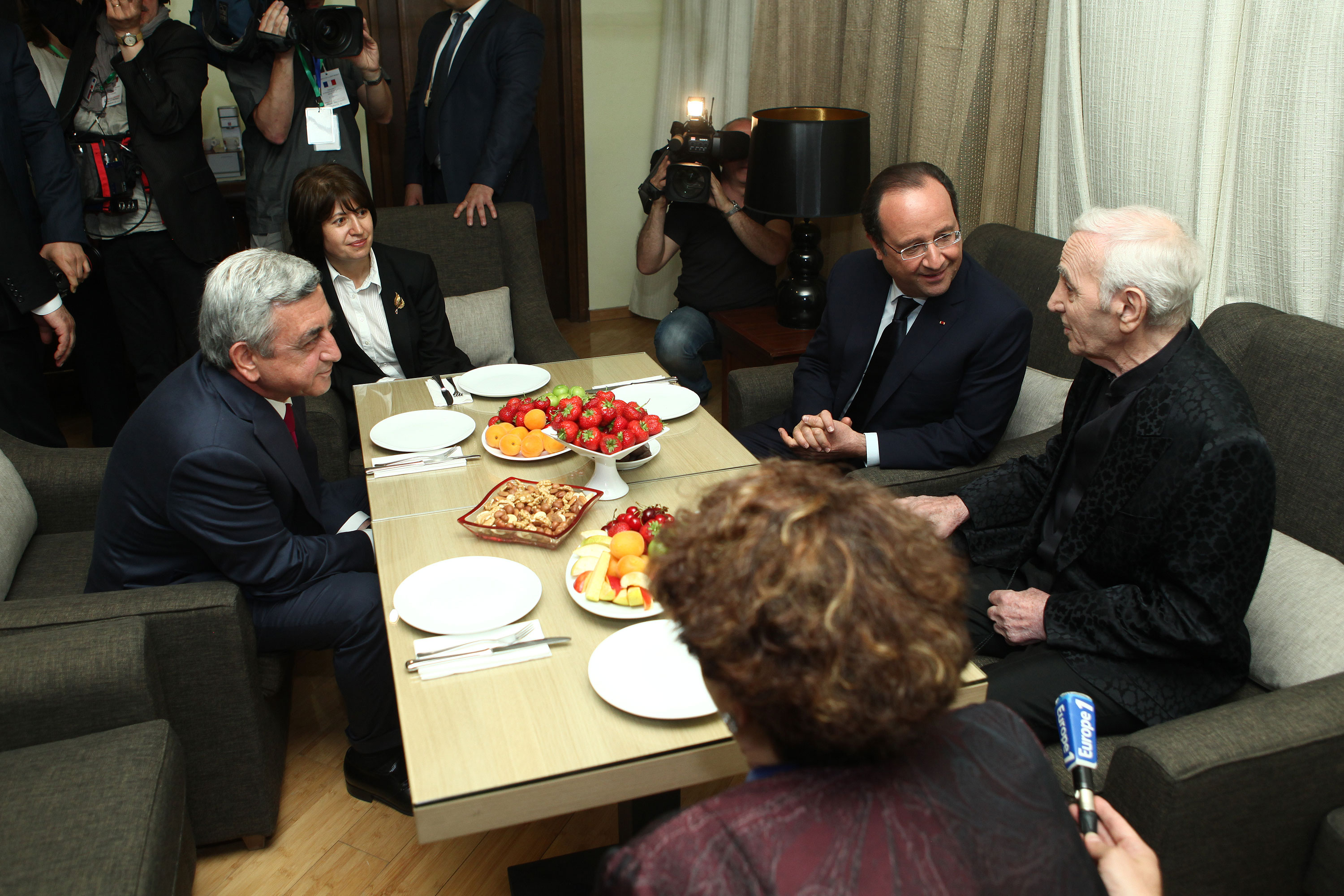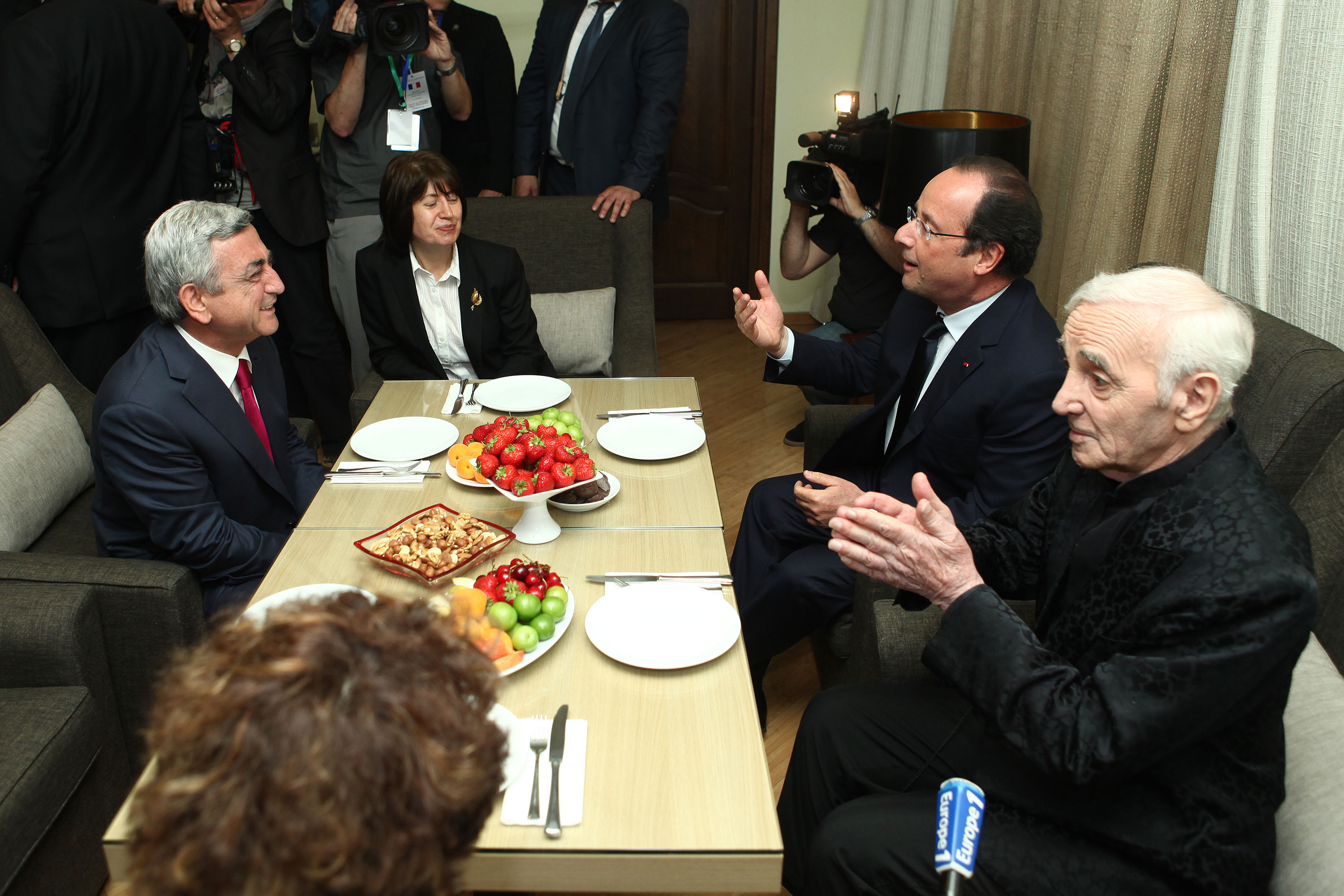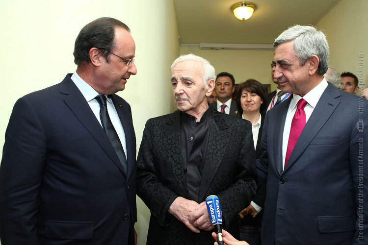 Президенты Серж Саргсян и находящийся с государственным визитом в Республике Армения Президент Французской Республики Франсуа Олланд сегодня в спортивно-концертном комплексе имени Карена Демирчяна присутствовали на проводимом под высоким патронатом президентов Армении и Франции юбилейном концерте 90-летия всемирно известного шансонье Шарля Азнавура. По завершении концерта президенты Серж Саргсян и Франсуа Олланд выразили признательность великому шансонье.