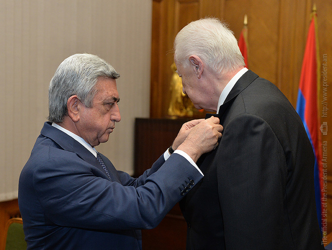 Президент РА Серж Саргсян сегодня представил руководящему составу Службы национальной безопасности (СНБ) при Правительстве РА новоназначенного директора СНБ РА Георгия Кутояна. Президент Республики проинформировал также, что бывший директор СНБ Горик Акопян в рамках закона освобожден от занимаемой должности по возрасту и продолжит свою службу Родине на должности советника Президента РА. Президент РА наградил Горика Акопяна орденом Святого Вардана Мамиконяна и выразил ему благодарность. «Горик Гургенович, от имени нашего государства благодарю Вас за многолетнюю последовательную и преданную работу. Несмотря на то, что с сегодняшнего дня Вы принимаете новые обязанности, новую сферу сотрудничества, будьте уверены, что Ваше имя уже вписано в историю государственного строительства РА. Вы воспитали большое поколение профессионалов, и я уверен, что и впредь многочисленные люди будут воспитываться по Вашему примеру. Спасибо вам за это, Горик Гургенович. Уверен, что господин Акопян еще продолжит вкладывать свой опыт и знания в важное дело государственного строительства РА. Учитывая все это, я вчера также подписал еще один указ, которым наградил Горика Акопяна орденом Святого Вардана Мамиконяна. Думаю, что для генералов, высокопоставленных военных РА этот орден является очень заветным и символичным. Это заслуженная Вами награда.