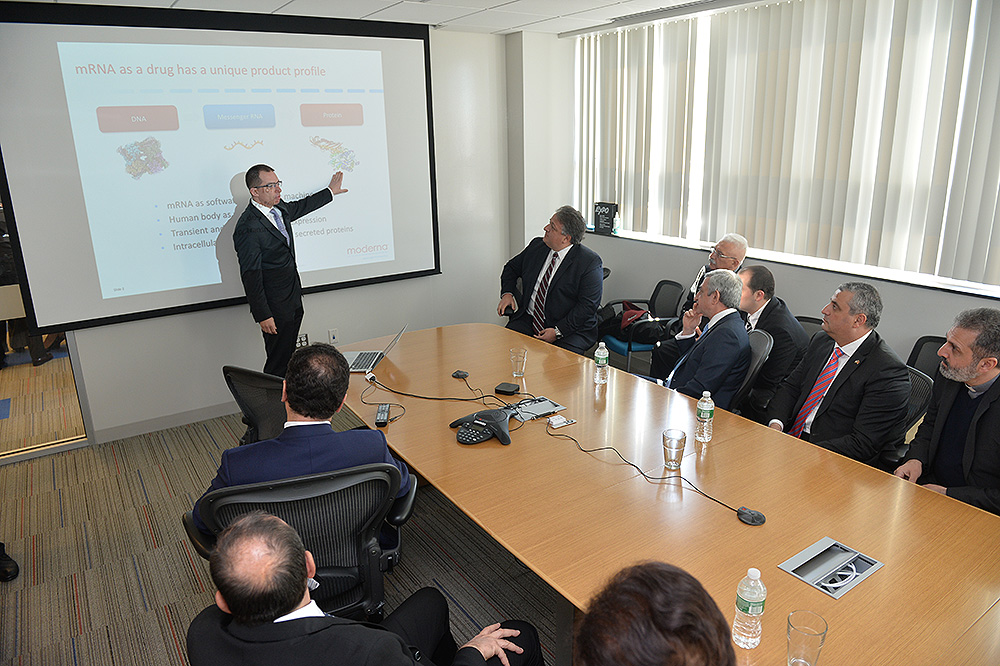 Исследовательская группа Moderna Therapeutics состоит из более трехсот сотрудников. Компания имеет исследовательские центры в Кембридже (Массачусетс) и в столице Швеции Стокгольме. Глава государства встретился с основателем компании Нубаром Афеяном и исполнительным директором Стефаном Бансели, а затем в их сопровождении совершил экскурсию по предприятию, увидел его работу и применяемые технологии, ознакомился с планами на будущее компании, наладившей сотрудничество с рядом крупных международных фармацевтических компаний и научно-исследовательских институтов.