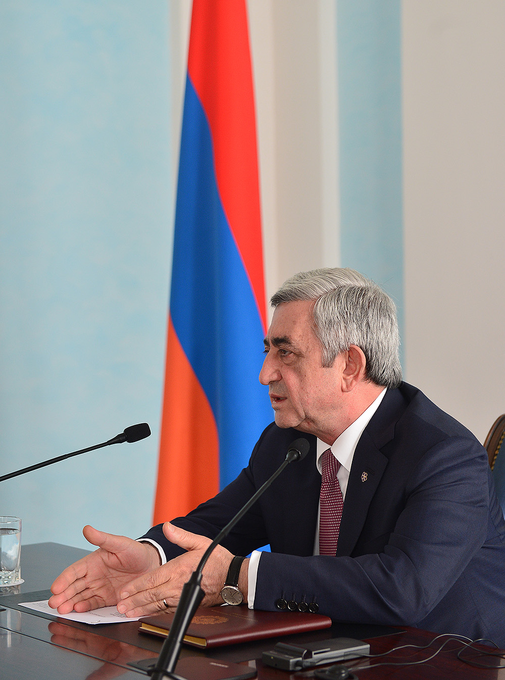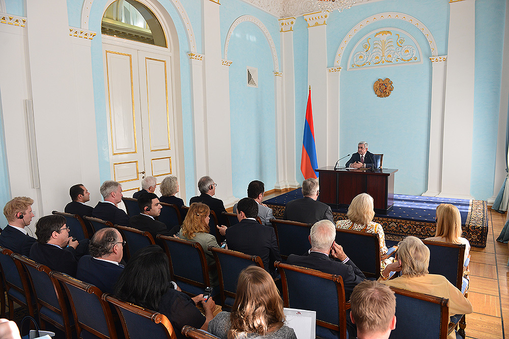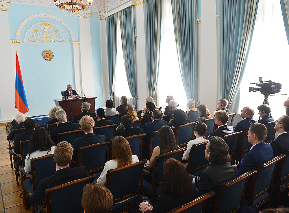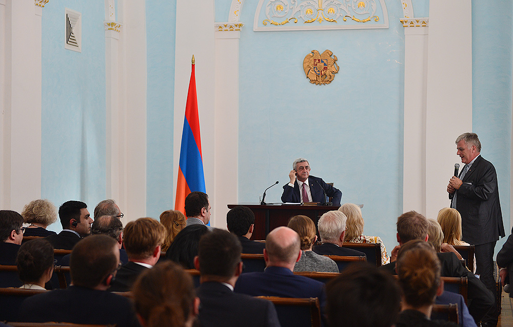 Серж Саргсян изъявил готовность ответить на вопросы присутствующих, которые касались как нынешнего этапа переговорного процесса по урегулированию нагорно-карабахского конфликта, имеющихся проблем и перспектив. Вопросы касались также совершенного в начале апреля с.г. грубого нарушения Азербайджаном на линии соприкосновения с НК соглашения 1994г. о прекращении огня и беспрецедентной агрессии в отношении народа НК. Речь шла также о развитии экономики Армении в связи с её членством в ЕАЭС, о созданных для иностранных инвестиций новых возможностях и благоприятных условиях, о сотрудничестве Армения-Евросоюз и о переговорах вокруг нового рамочного соглашения, направленного на развитие такого сотрудничества. Участники встречи задавали вопросы также относительно международного процесса признания и осуждения Геноцида армян, важности этого процесса для всего человечества, региональных проблем и перспектив развития, приоритетов экономики РА, отношений РА-РФ и ряда других тем.
