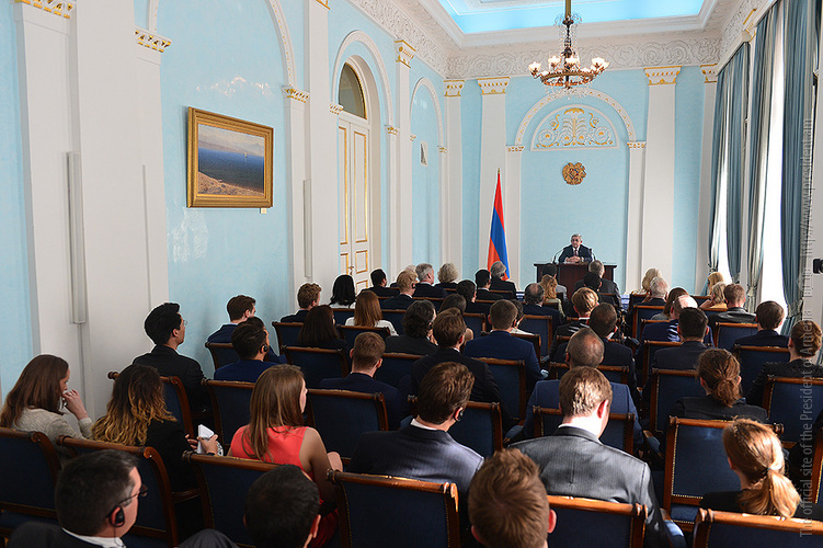 Президент РА приветствовал гостей и отметил важность контактов с молодежью, что, по его мнению, является хорошей возможностью для обсуждения с новым поколением актуальных вызовов и ознакомления с новаторскими идеями. «Буквально несколько дней назад в этом же зале я принимал членов совета Европейского молодежного форума, и у нас состоялась интересная беседа. Надеюсь, что «Global Bridge» будет эффективно работать в Армении. Знаю, что ваша организация со дня основания призвана активировать диалог между представителями разных континентов, сближать отношения, укреплять взаимодействие, а также стимулировать деятельность молодежи. Цели организации полностью созвучны нашей политике, и мы постоянно работаем, чтобы привлечь молодежь в процесс принятия нашими государственными структурами решений и, что самое важное, дать молодежи активную роль в реализации этих решений», - сказал Президент Серж Саргсян, представив, какими механизмами проводится эта работа с молодежью законодательными и исполнительными органами, а также на партийном уровне.