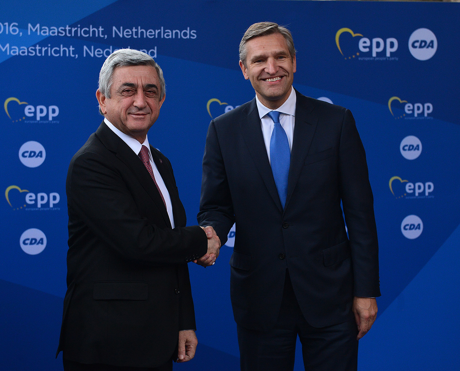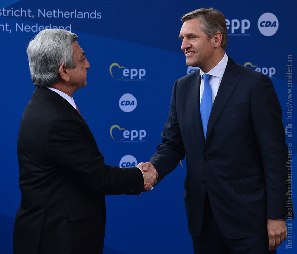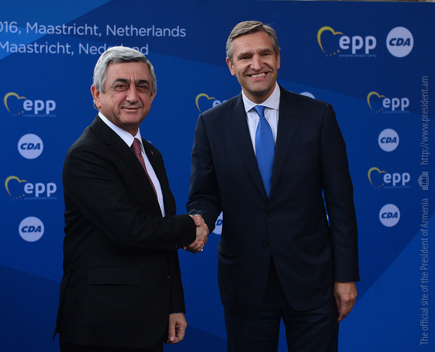 Находящийся с рабочим визитом в Маастрихте Президент Серж Саргсян сегодня принял участие в саммите Европейской народной партии (ЕНП). Его вел председатель ЕНП Жозеф Дол. В саммите участвовали председатель Европейского Совета Дональд Туск, председатель Европейской комиссии Жан-Клод Юнкер, главы государств и правительств стран-членов Европейского Союза и Восточного партнерства, представляющие партии-члены ЕНП.