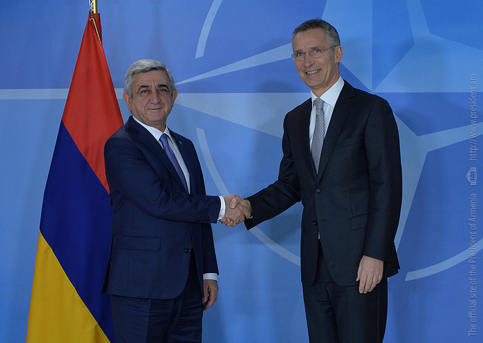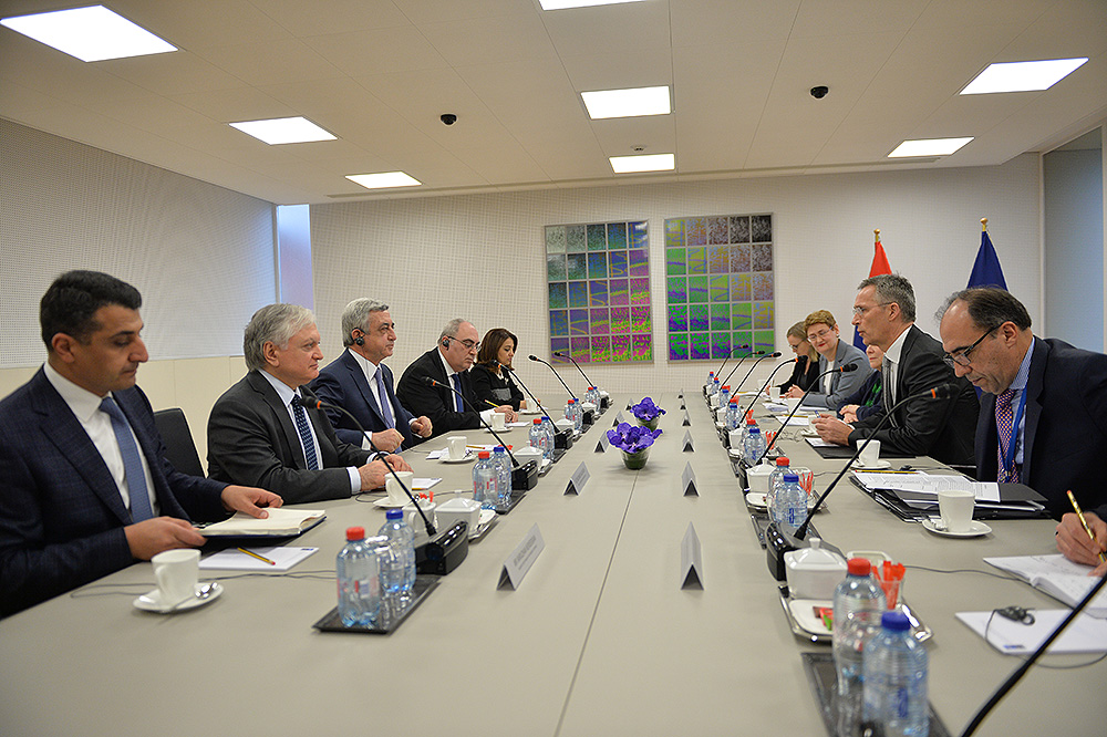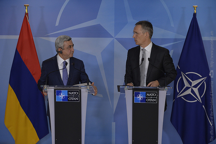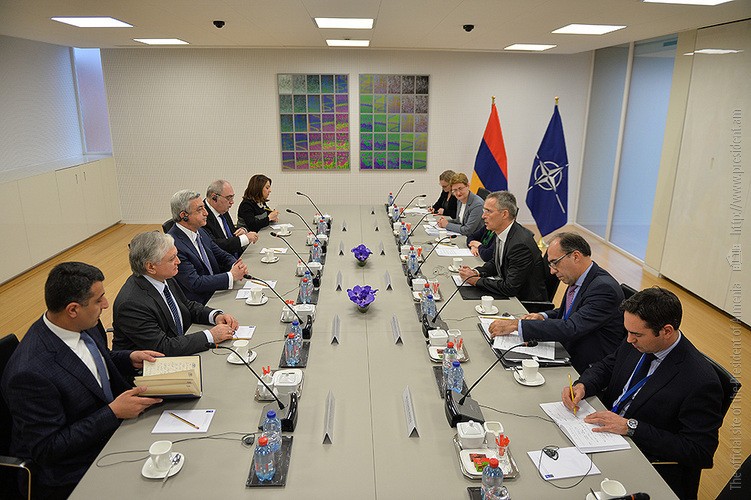 Мы с Генеральным секретарём обоюдно подчеркнули важность сохранения нынешнего уровня политического диалога и продолжения регулярных контактов, а также обсудили вопросы, касающиеся дальнейшего развития и расширения наших партнёрских отношений с НАТО. Мы констатировали, что успешно реализованы четыре плана действий Индивидуального партнёрства Армения-НАТО, и в настоящее время на этапе утверждения находится уже пятый план на 2017-2019 годы. Мы чётко подчеркнули важность скорого старта деятельности в Армении Фонда доверия НАТО. И я пригласил господина Генерального секретаря посетить Армению, что будет очень хорошим поводом обобщить сделанное нами за эти 25 лет и наметить будущие наши действия.