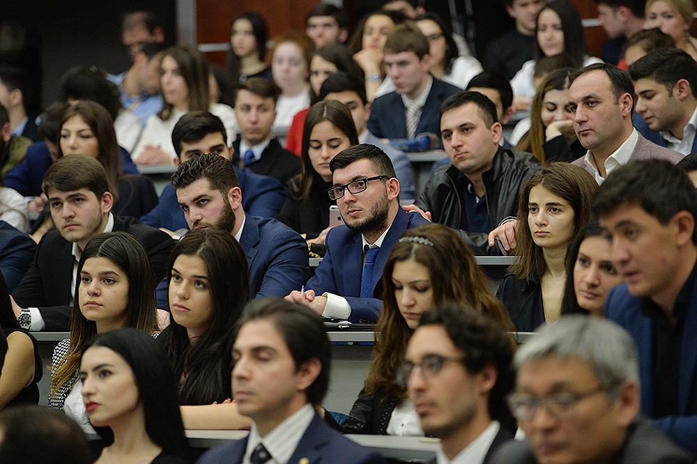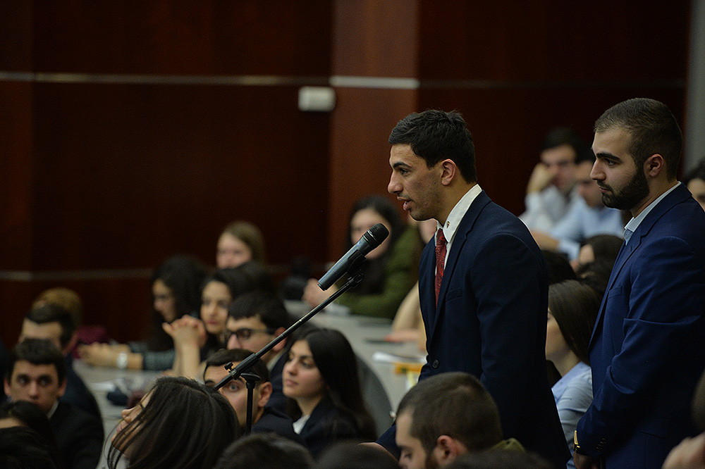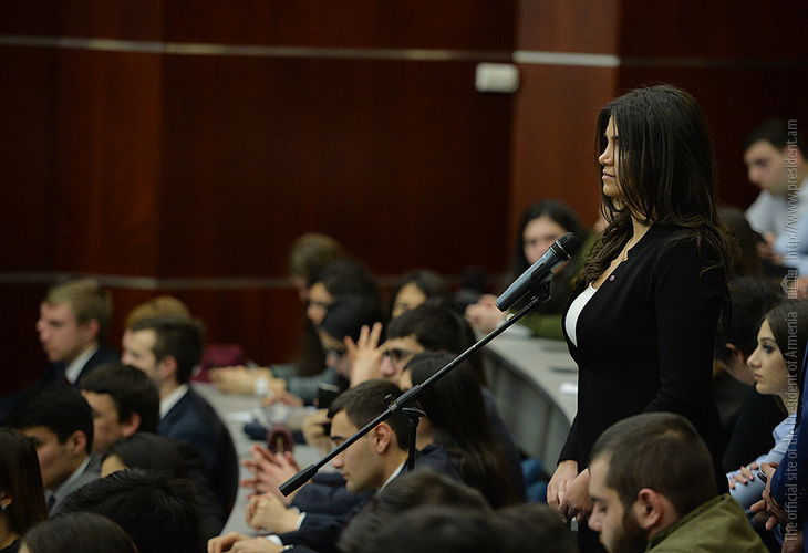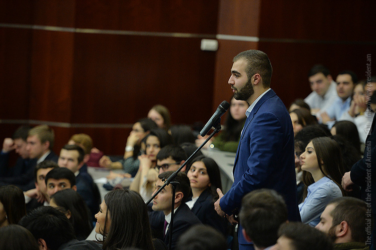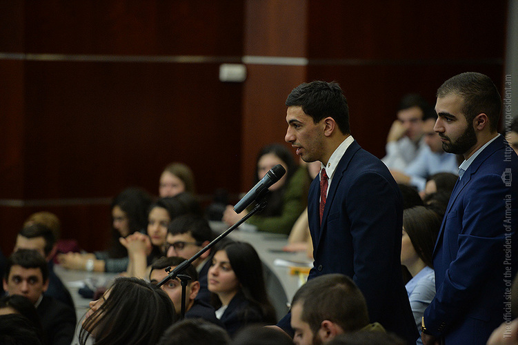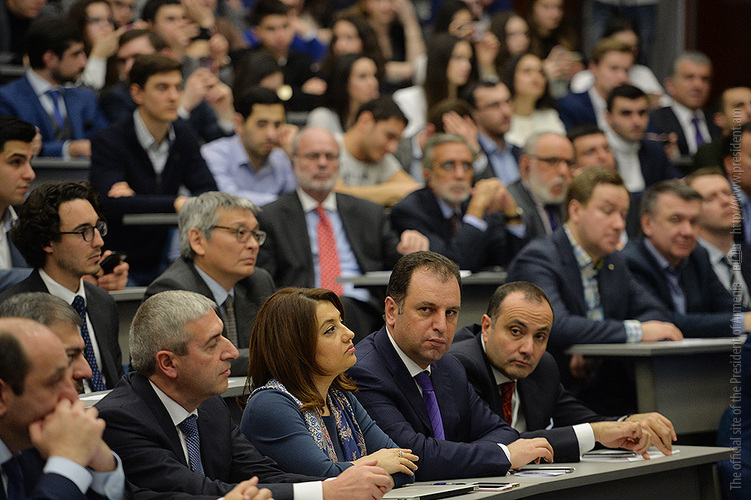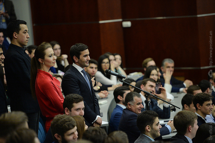 После церемонии присуждения звания Президент Республики выступил перед университетскими с речью и ответил на интересовавшие их вопросы, которые касались достижений и успехов Армении в торгово-экономической сфере за прошедшие почти три года после вступления в ЕАЭС, перспектив сотрудничества Армении с Евросоюзом, возможного влияния на внешнюю политику Армении перехода в результате конституционных реформ на новую - парламентскую систему правления, степени боеспособности ВС РА и предпринимаемых в настоящее время усилий по урегулированию НК проблемы.