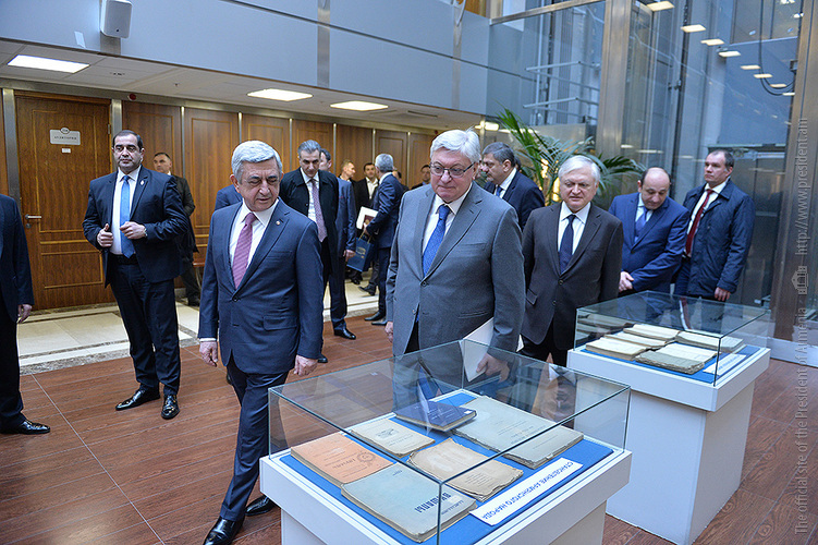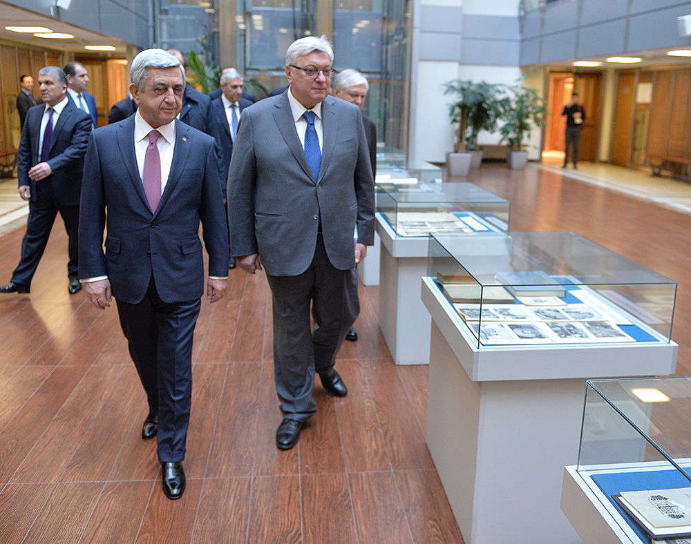Президент вместе с ректором вуза Анатолием Торкуновым осмотрел открытую в фойе института выставку ценных изданий, оставшихся в наследство от Лазаревых, которые хранятся в библиотеке вуза и сегодня представлены для обозрения в связи с визитом Президента РА. В Московском Государственном институте международных отношений Президент Саргсян имел отдельную беседу с ректором вуза Анатолием Торкуновым, после чего состоялась встреча Сержа Саргсяна со студентами и профессорско-преподавательским составом.