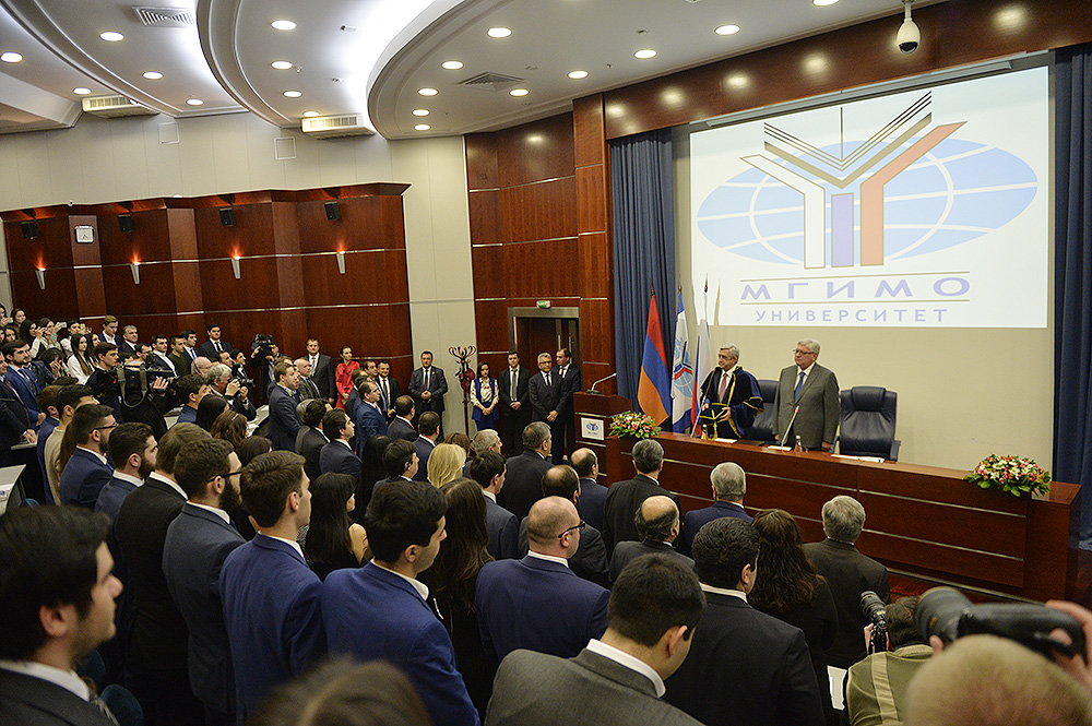 Ректор Торкунов приветствовал Президента РА в одном из авторитетных вузов России, Московском Государственном институте международных отношений, кратко представил аудитории Президента Саргсяна, после чего зачитал решение учёного совета вуза о присуждении Президенту РА Сержу Саргсяну звания "Почётный доктор МГИМО". Ректор Торкунов вручил Президенту свидетельство "Почётного доктора" и поздравил в этой связи.