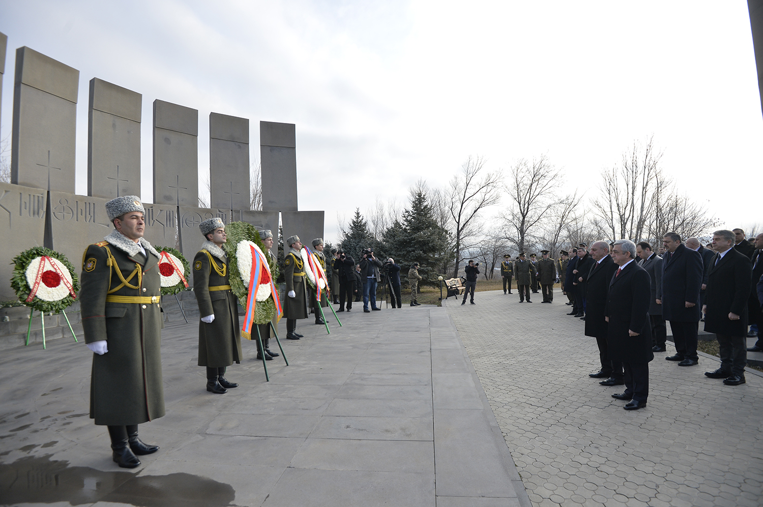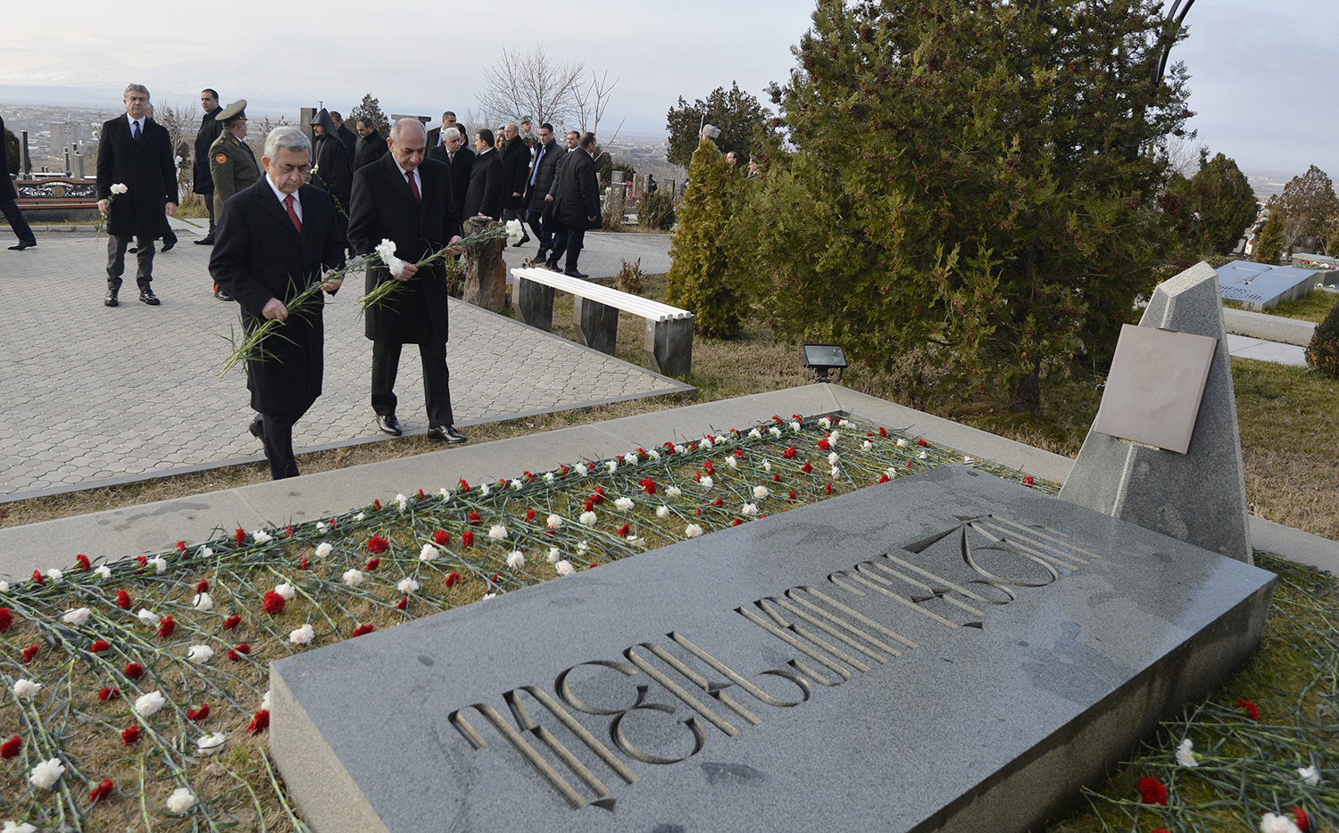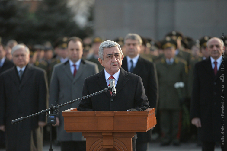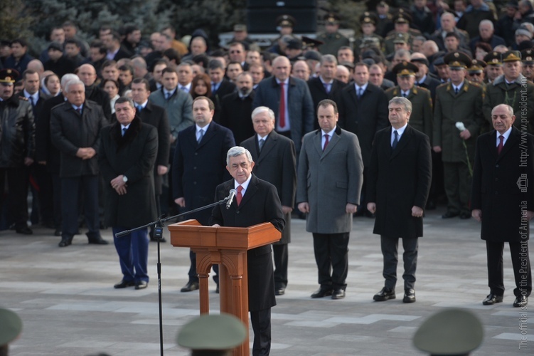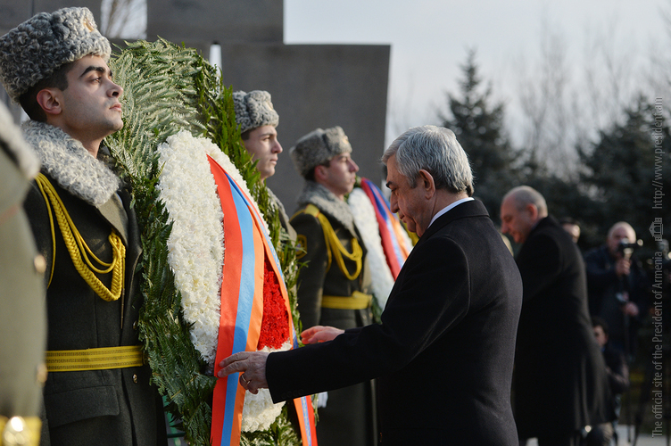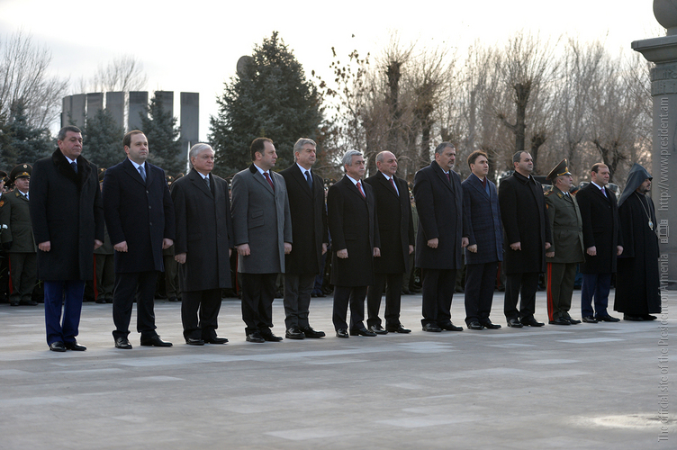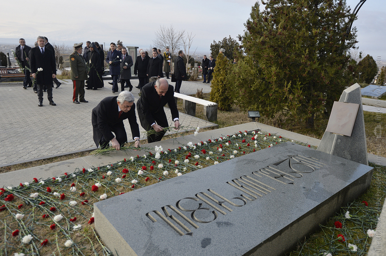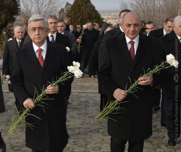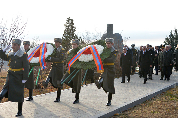 По случаю Дня армии Президент Серж Саргсян в сопровождении Президента НКР Бако Саакяна, членов Совета национальной безопасности, руководящего состава МО и ВС сегодня посетил воинский пантеон "Ераблур", воздал дань уважения памяти воинов, пожертвовавших своими жизнями во имя независимости Отечества.