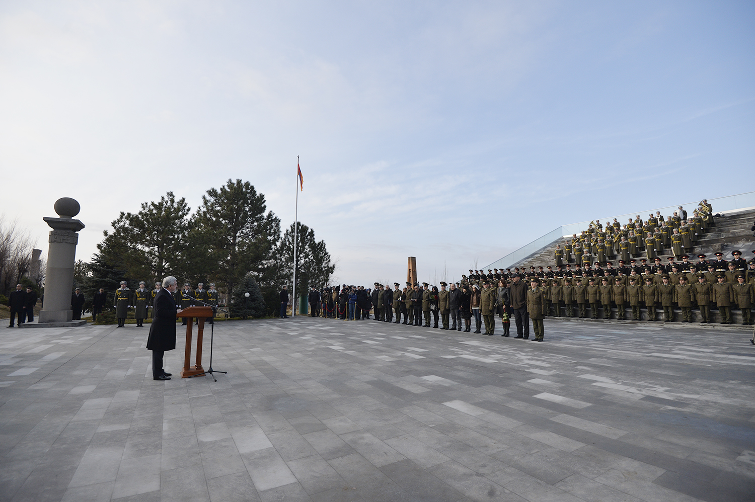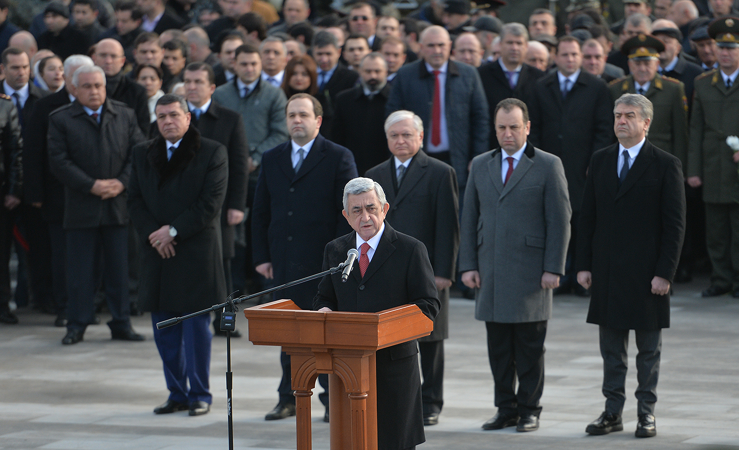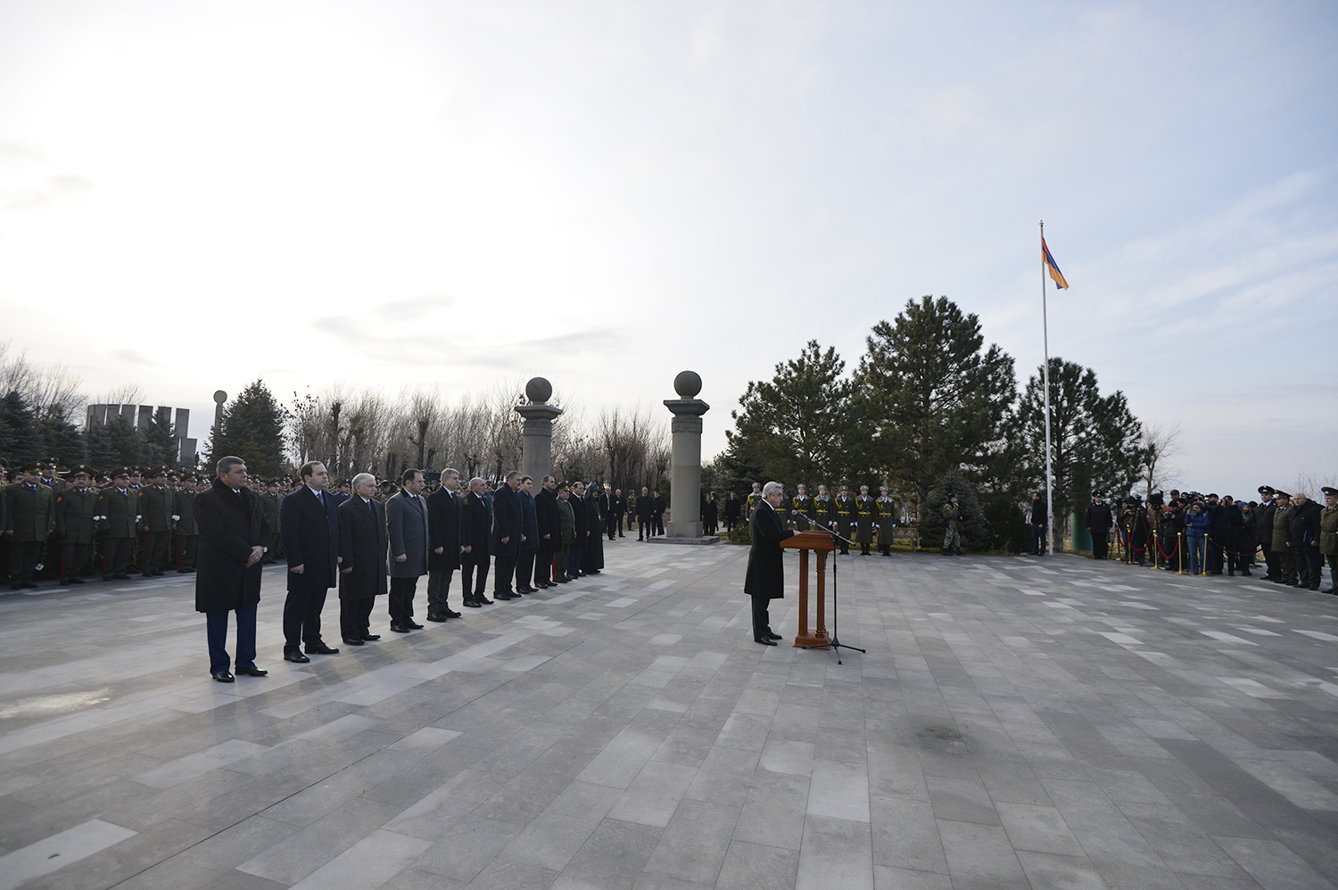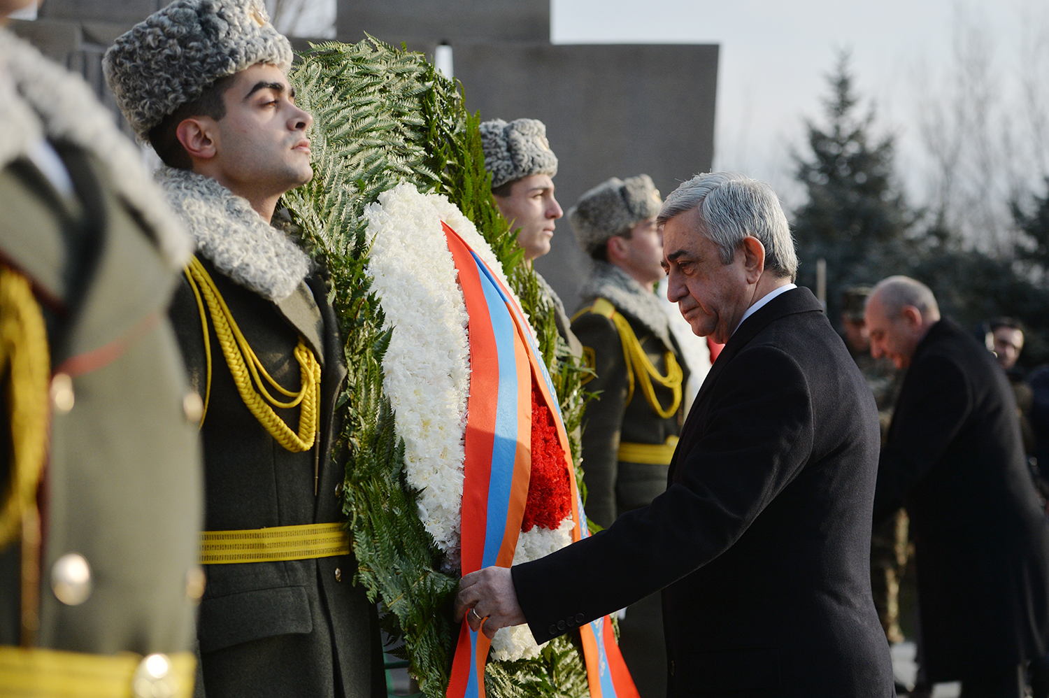 По случаю Дня армии Президент Серж Саргсян в сопровождении Президента НКР Бако Саакяна, членов Совета национальной безопасности, руководящего состава МО и ВС сегодня посетил воинский пантеон "Ераблур", воздал дань уважения памяти воинов, пожертвовавших своими жизнями во имя независимости Отечества.