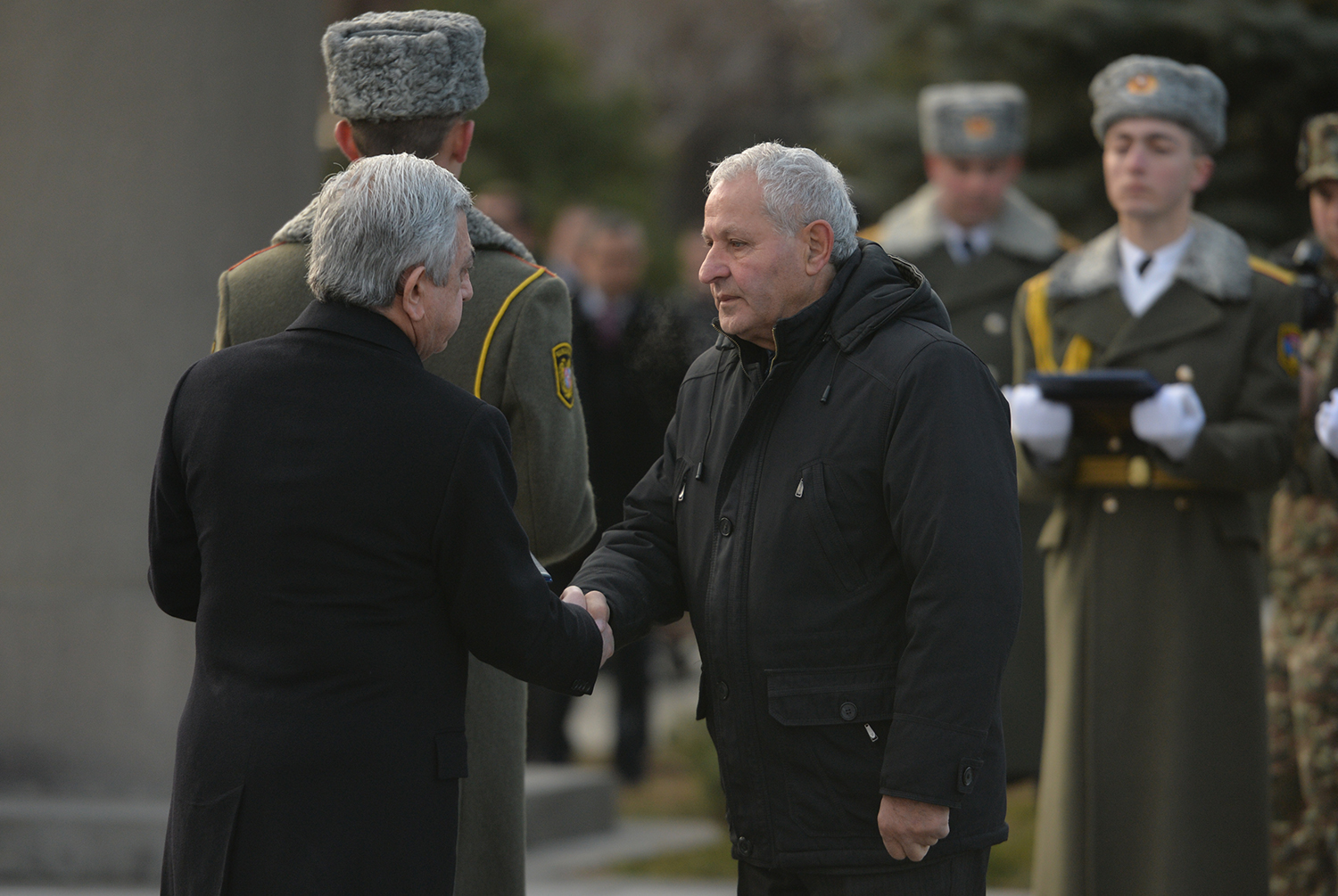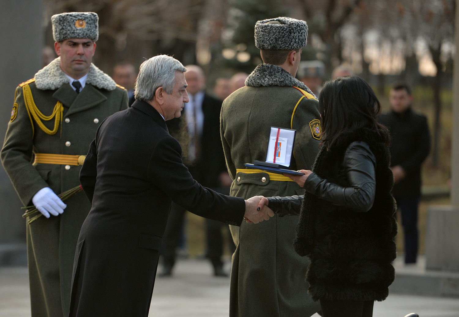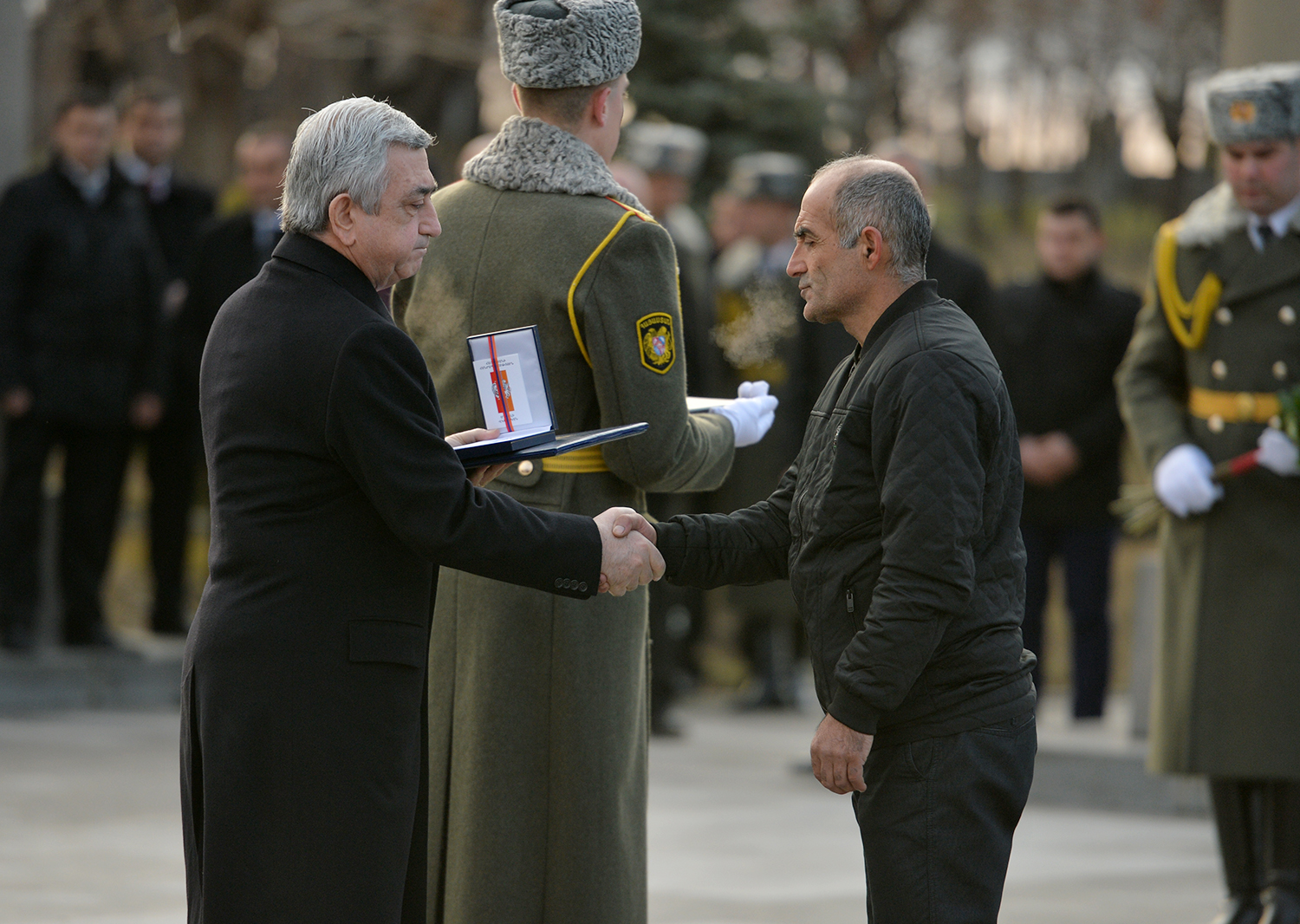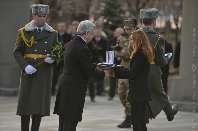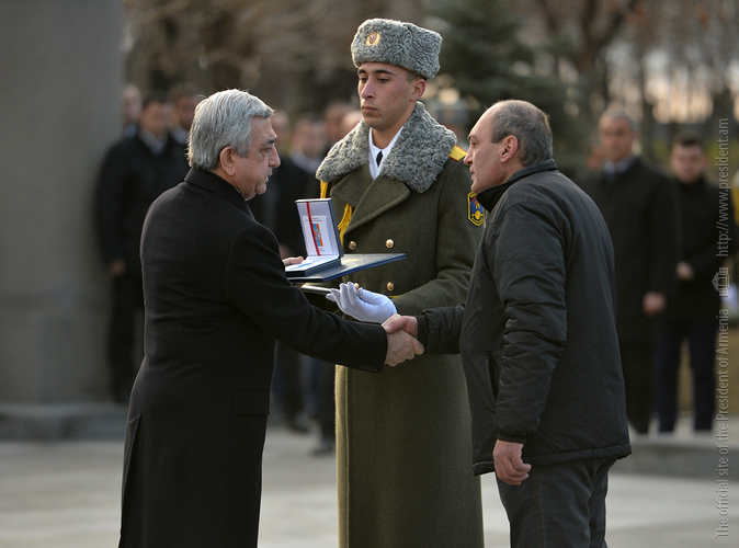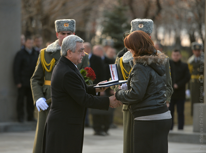 До этого Президент Саргсян вручил членам семей погибших военнослужащих высокие государственные награды, которых герои удостоились посмертно за проявленные при защите границ Отечества самоотверженность и храбрость. На церемонии присутствовали также прикреплённые этим семьям курсанты, а также курсанты военного университета МО имени Вазгена Саргсяна, военно-авиационного университета имени Арменака Ханферянца и воспитанники военно-спортивного училища МО имени Монте Мелконяна.