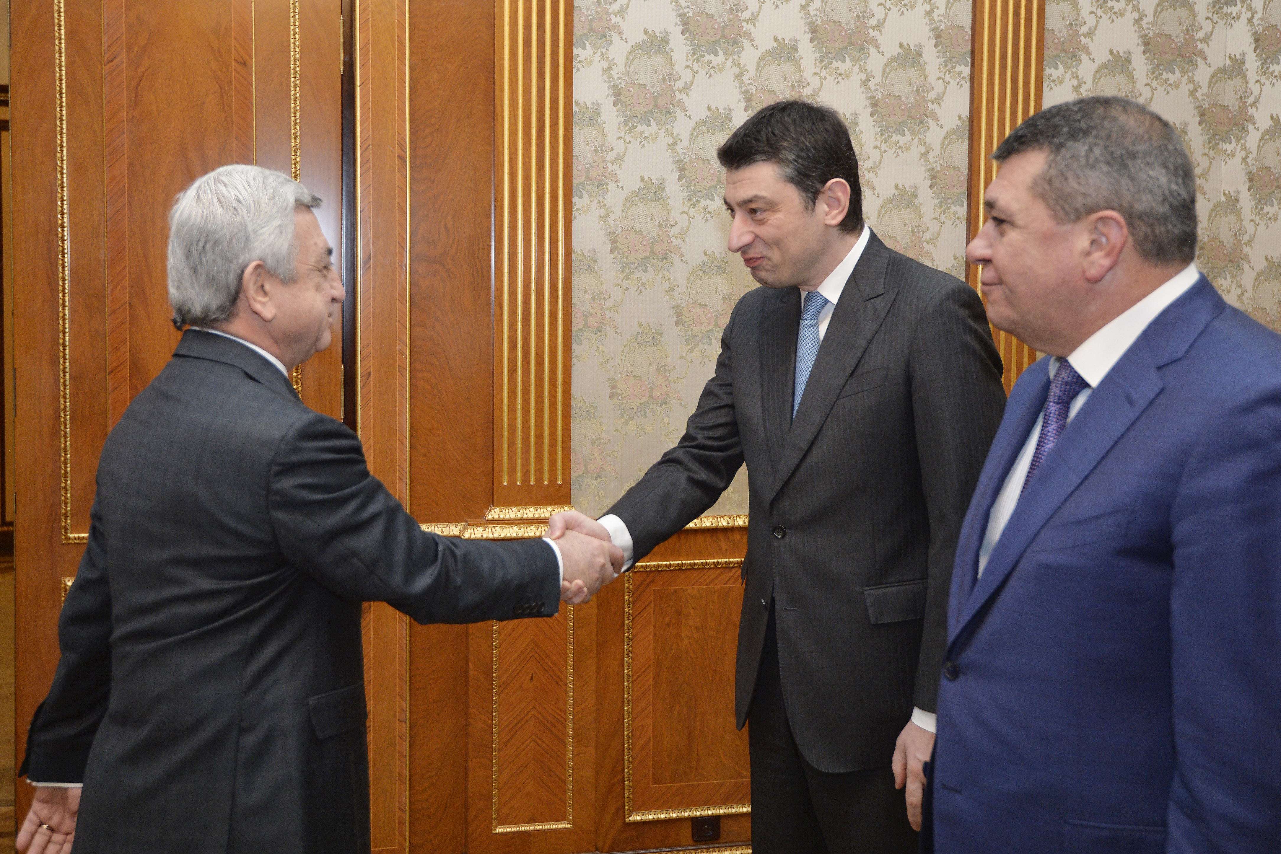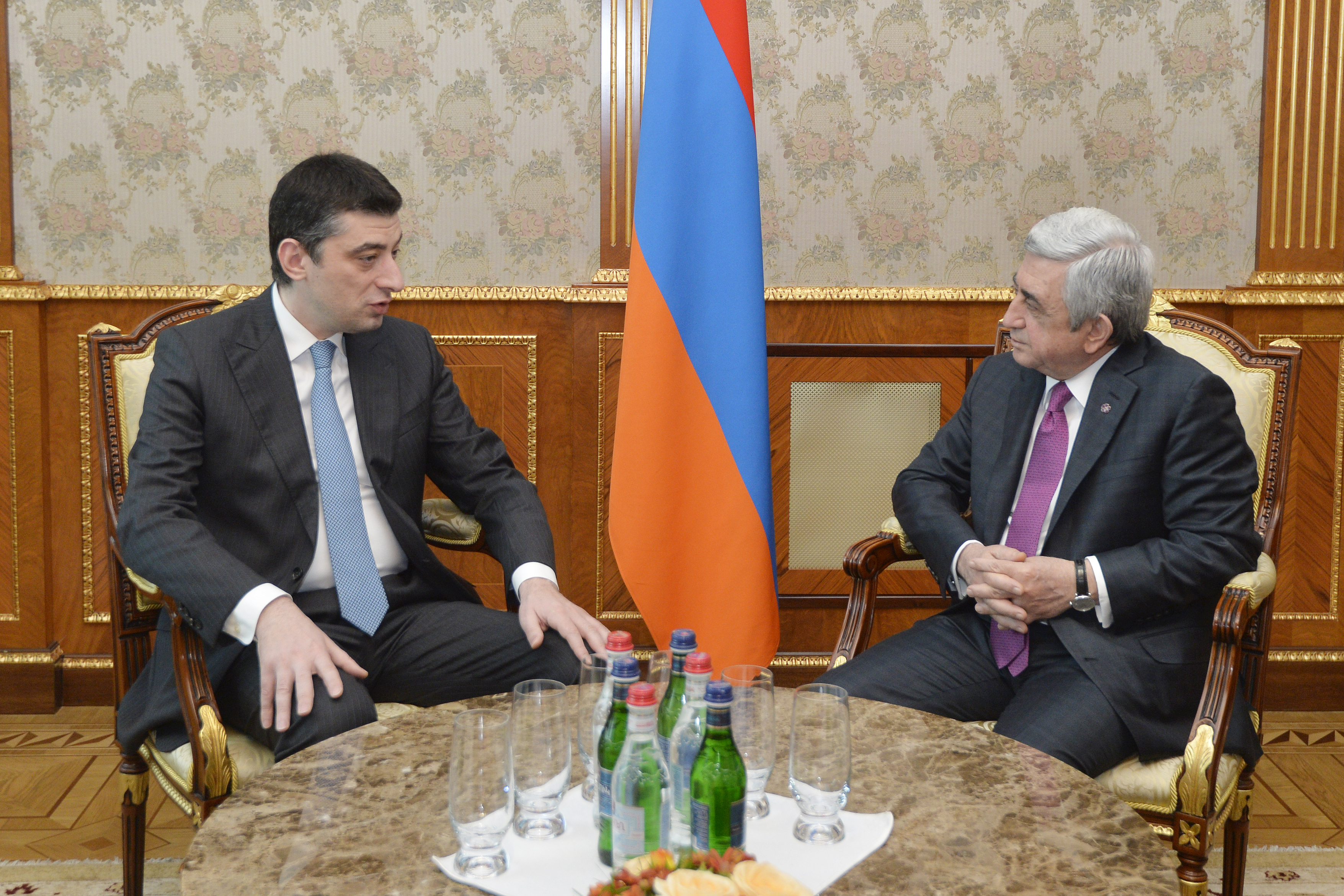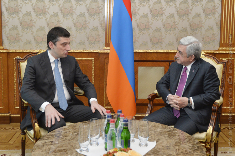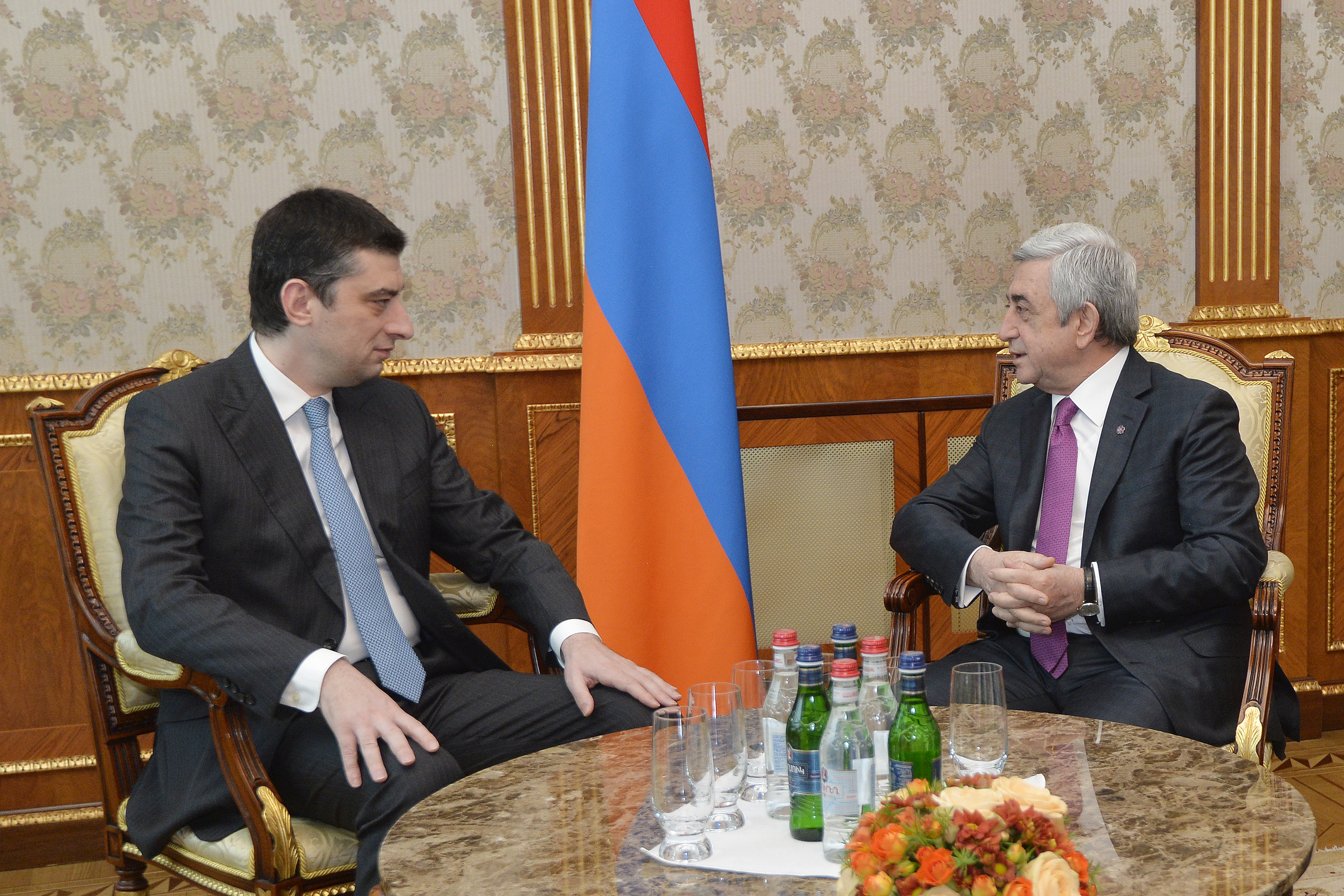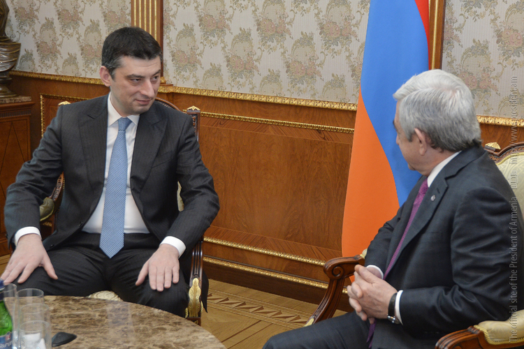 Приветствуя гостя, Президент Республики поздравил его с назначением на пост вице-премьера, министра внутренних дел Грузии и отметил, что с теплотой вспоминает состоявшуюся в Ереване летом прошлого года встречу с Гиоргием Гахарией в прежней должности министра экономики и стабильного развития Грузии, когда темой обсуждения были армяно-грузинские торгово-экономические отношения. Президент Саргсян также с особой теплотой вспомнил свой официальный визит в Грузию в конце прошлого года и встречи с высшим руководством страны и Католикосом Патриархом всея Грузии. В этом контексте Президент Республики подчеркнул важное значение в деле укрепления двусторонних отношений частые взаимные визиты и выразил надежду, что визит министра Гахарии в Армению придаст новый импульс углублению сотрудничества между правоохранными ведомствами Армении и Грузии. Собеседники обоюдно сочли важным взаимодействие в этой сфере и обеспечение безопасности и стабильности в двух дружественных странах также с точки зрения прогресса и достижений в экономической, гуманитарной и других сферах.