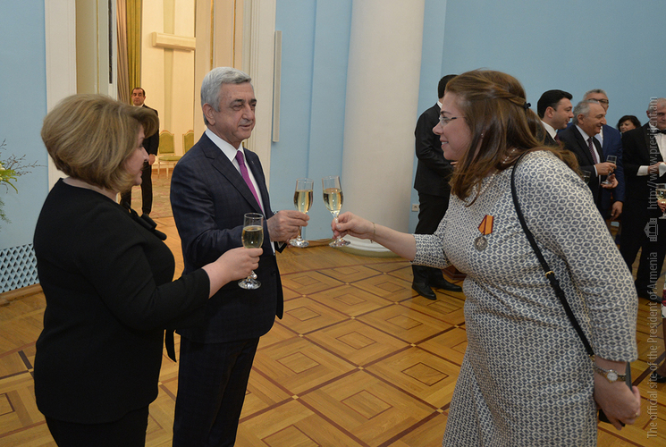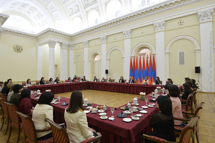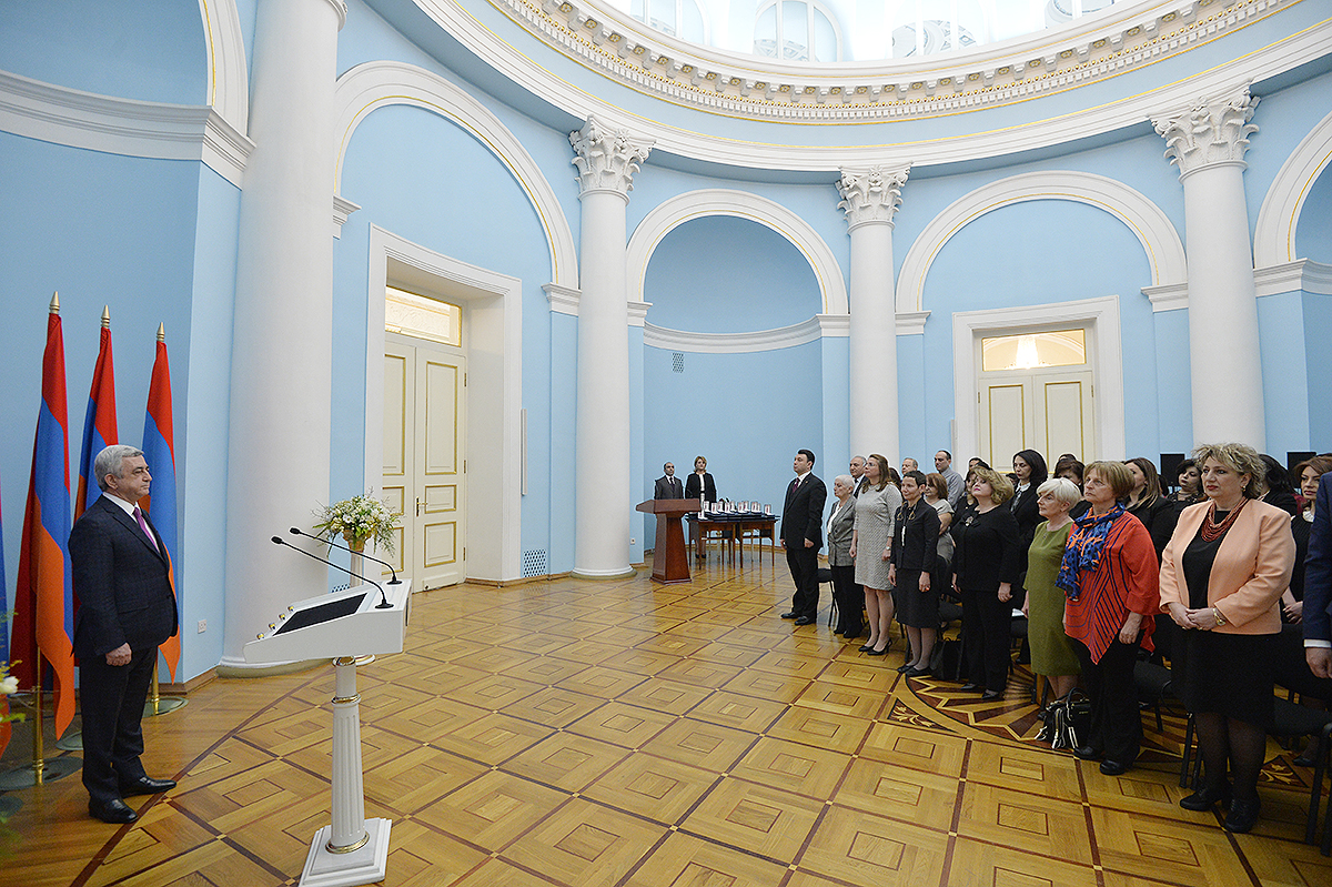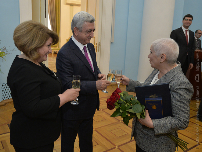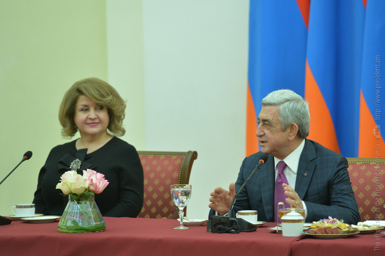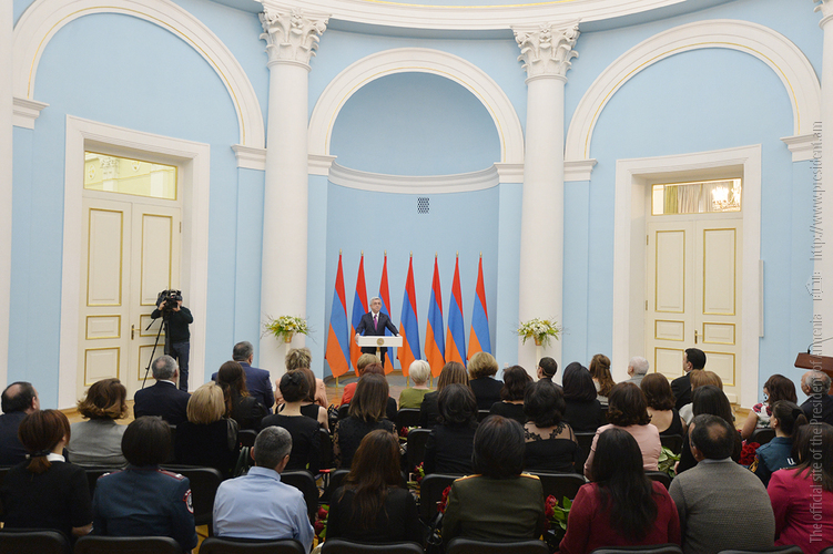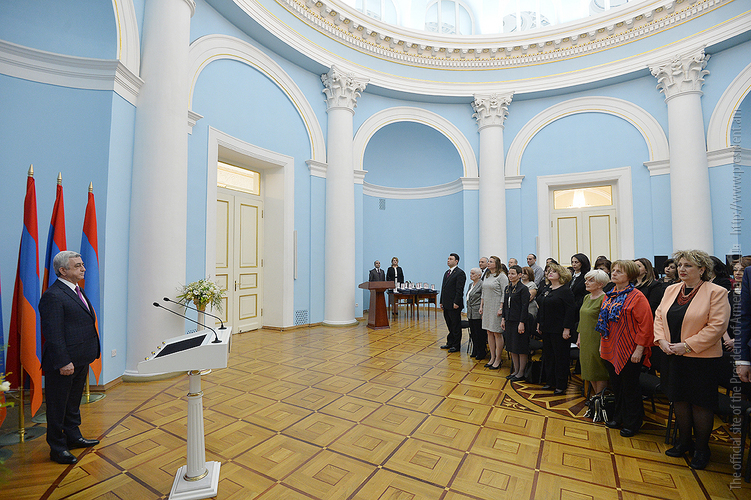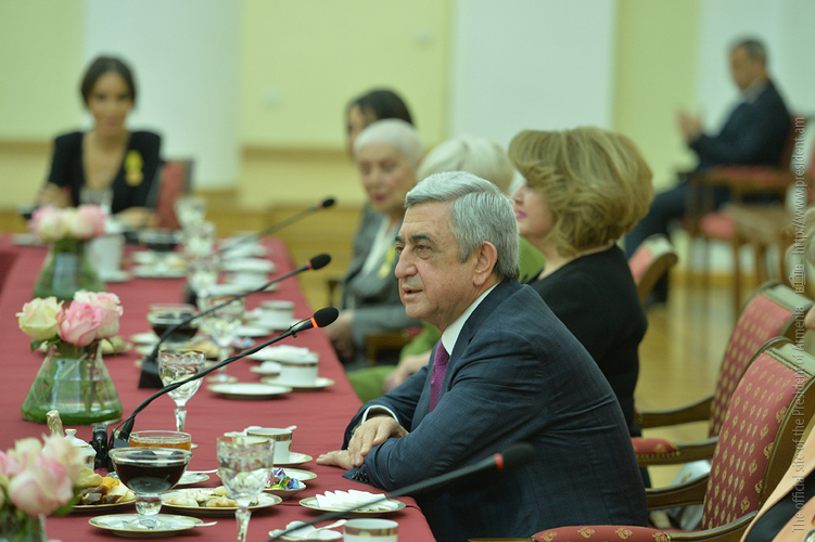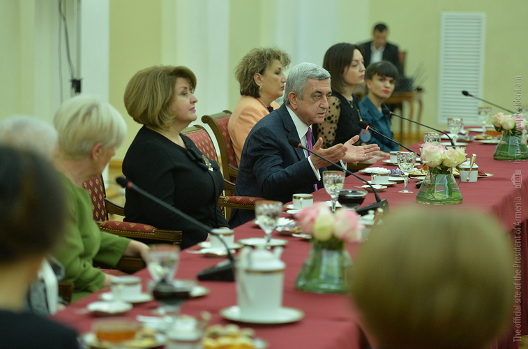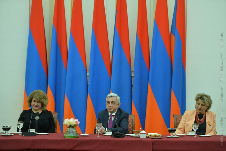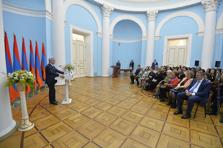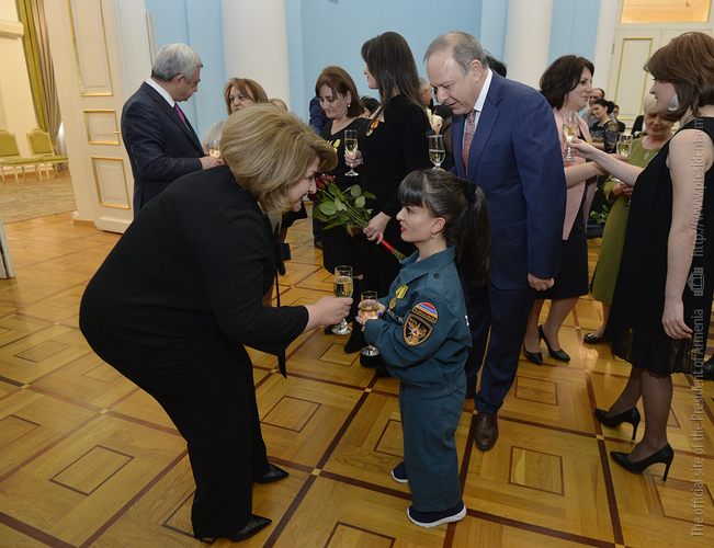 Накануне Женского праздника Президент Серж Саргсян и госпожа Рита Саргсян сегодня в резиденции Президента принимали группу женщин, которые внесли свой вклад в различные сферы, отличились эффективным и добросовестным трудом, а также многодетных родителей. Президент Республики поздравил участников встречи и в их лице всех женщин Республики с наступающим праздником. Президент также поощрил высокими государственными наградами приглашённых в резиденцию женщин, а многодетным матерям за большой вклад в становление и укрепление семьи, обеспечение детям полноценного и гармоничного физического, духовного и нравственного развития наградил медалью Родительской славы, а также поощрил денежными премиями.