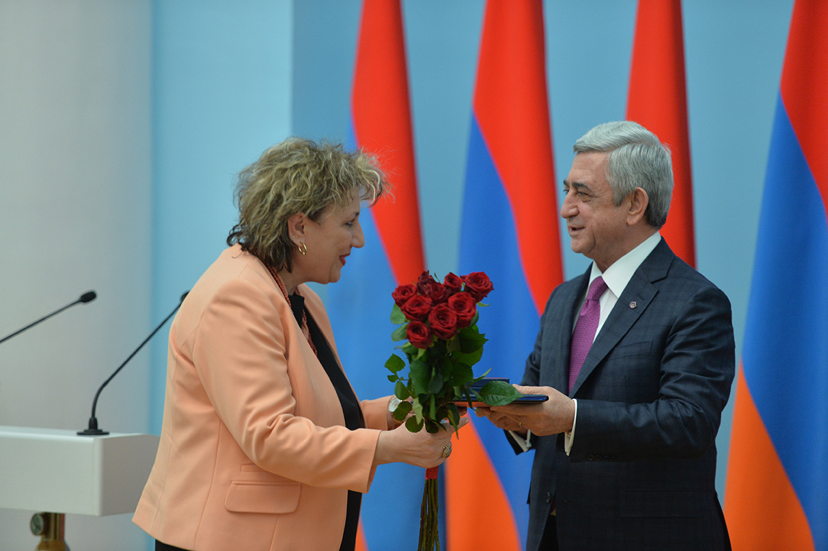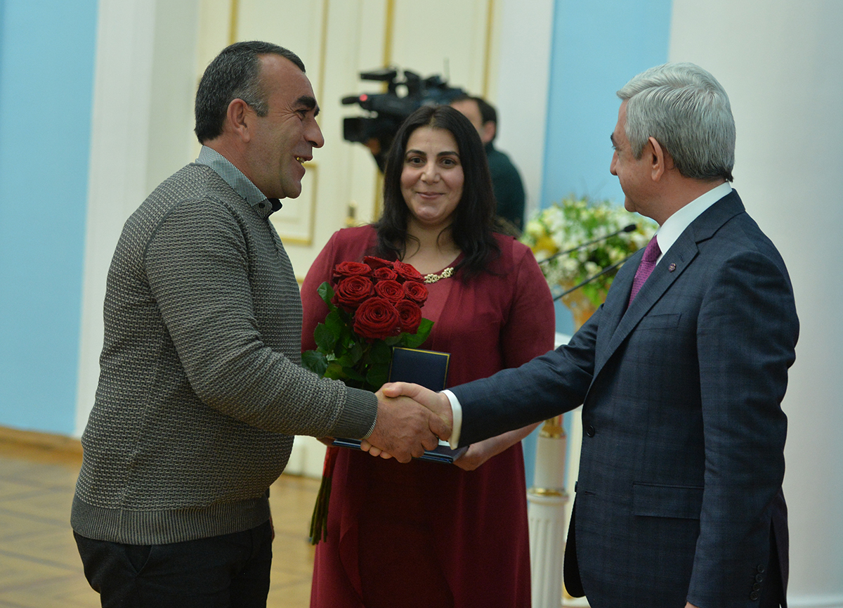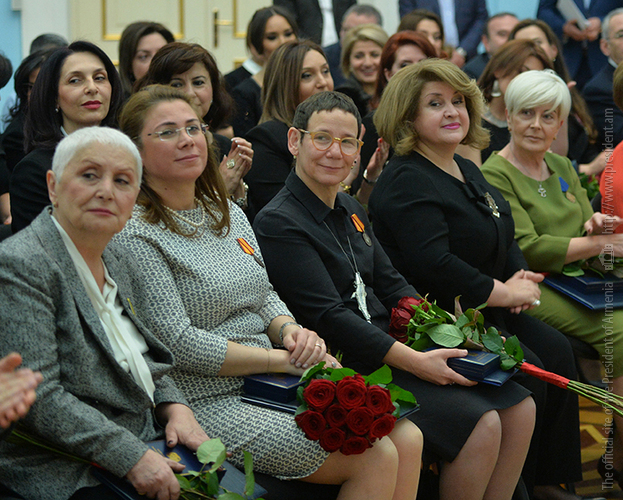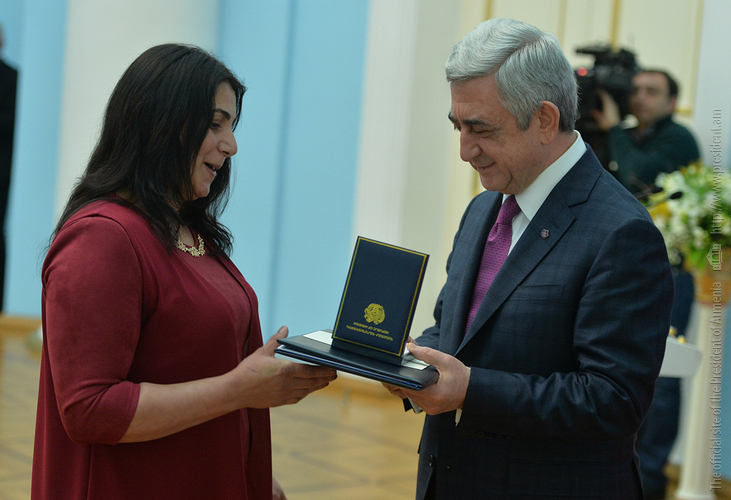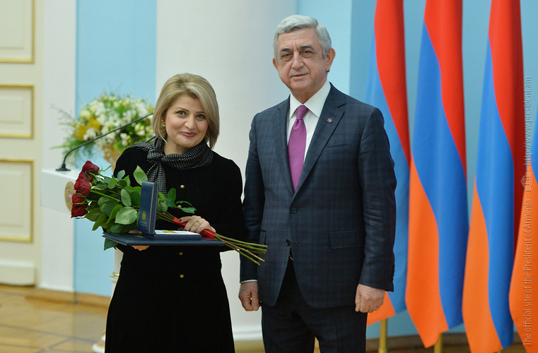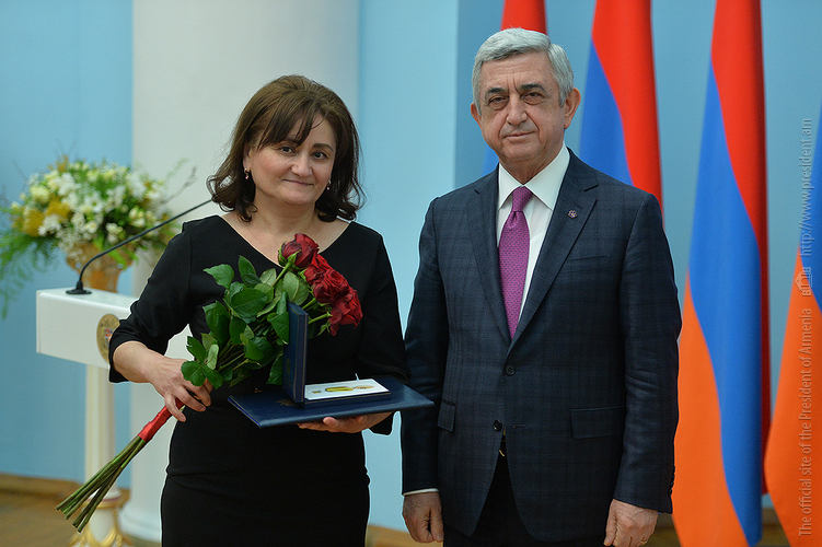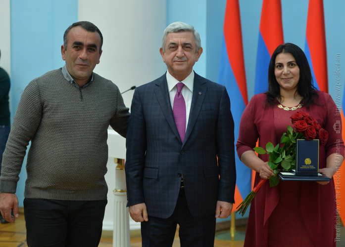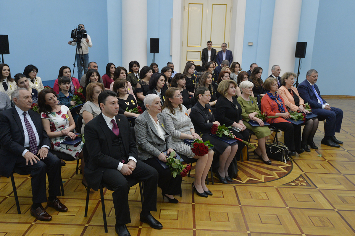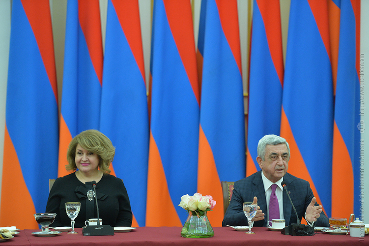 Накануне Женского праздника Президент Серж Саргсян и госпожа Рита Саргсян сегодня в резиденции Президента принимали группу женщин, которые внесли свой вклад в различные сферы, отличились эффективным и добросовестным трудом, а также многодетных родителей. Президент Республики поздравил участников встречи и в их лице всех женщин Республики с наступающим праздником. Президент также поощрил высокими государственными наградами приглашённых в резиденцию женщин, а многодетным матерям за большой вклад в становление и укрепление семьи, обеспечение детям полноценного и гармоничного физического, духовного и нравственного развития наградил медалью Родительской славы, а также поощрил денежными премиями.