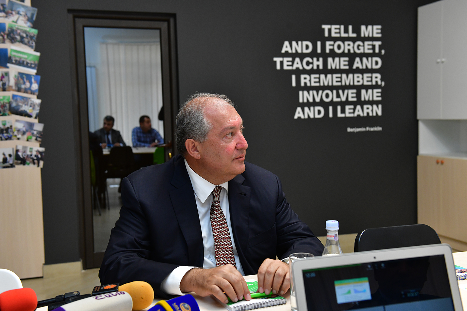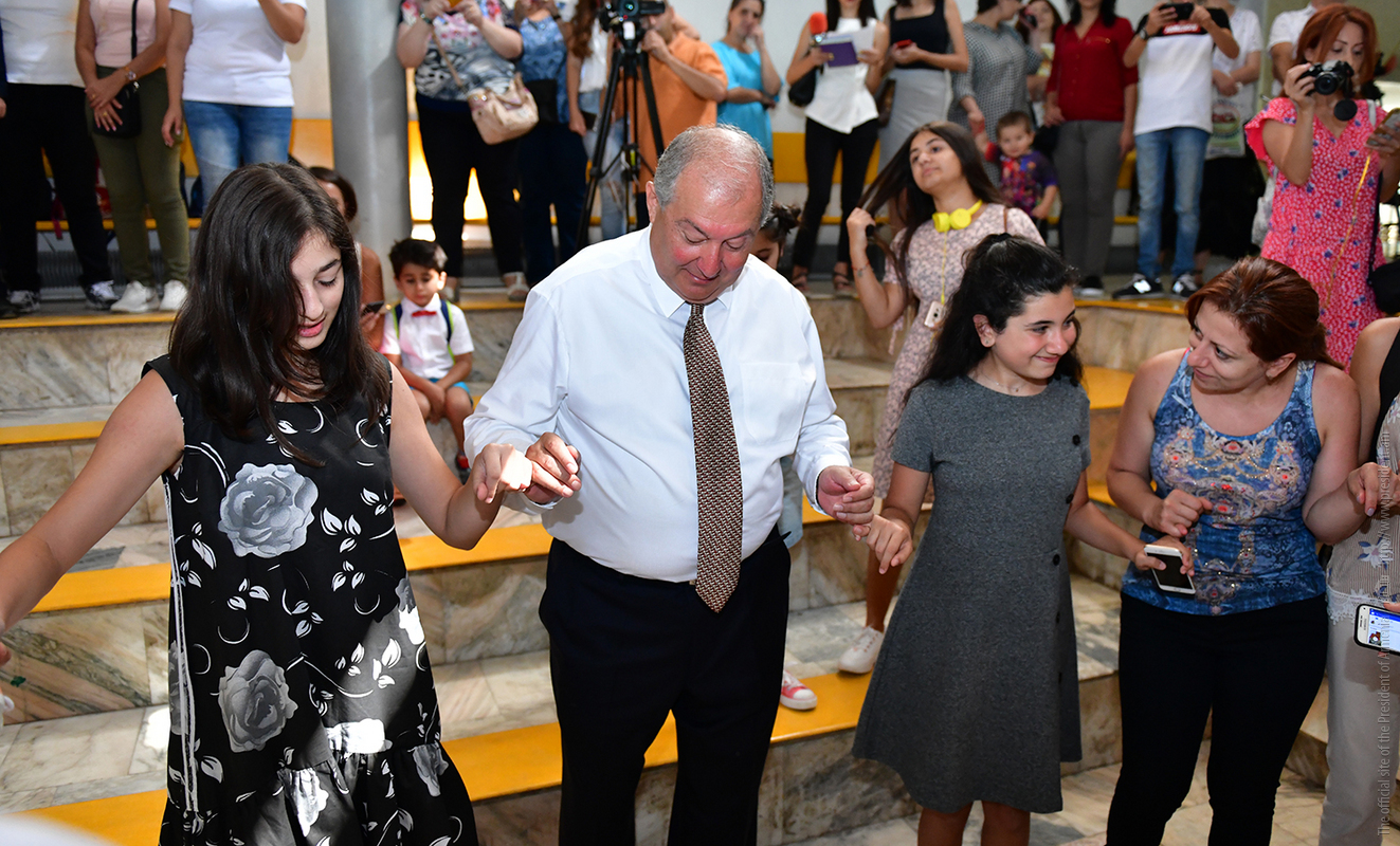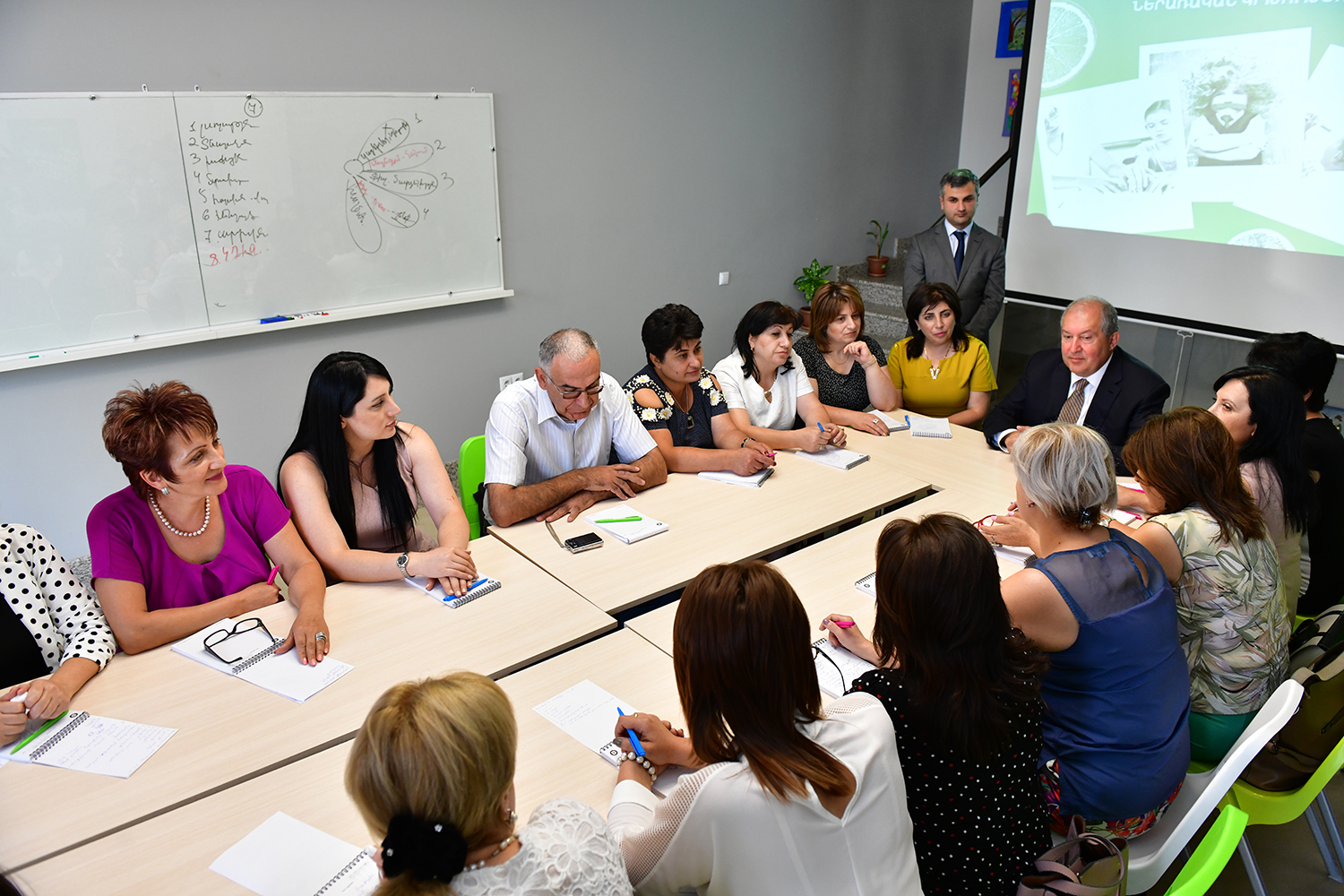 Армен Саркисян побеседовал с участвующими в рабочем семинаре по современным формам образования, инклюзивному образованию и защите прав ребёнка учителями, которые представляют столичные и областные школы. Президент также присутствовал на преподаваемом школьникам специальном уроке «Первая медицинская помощь».