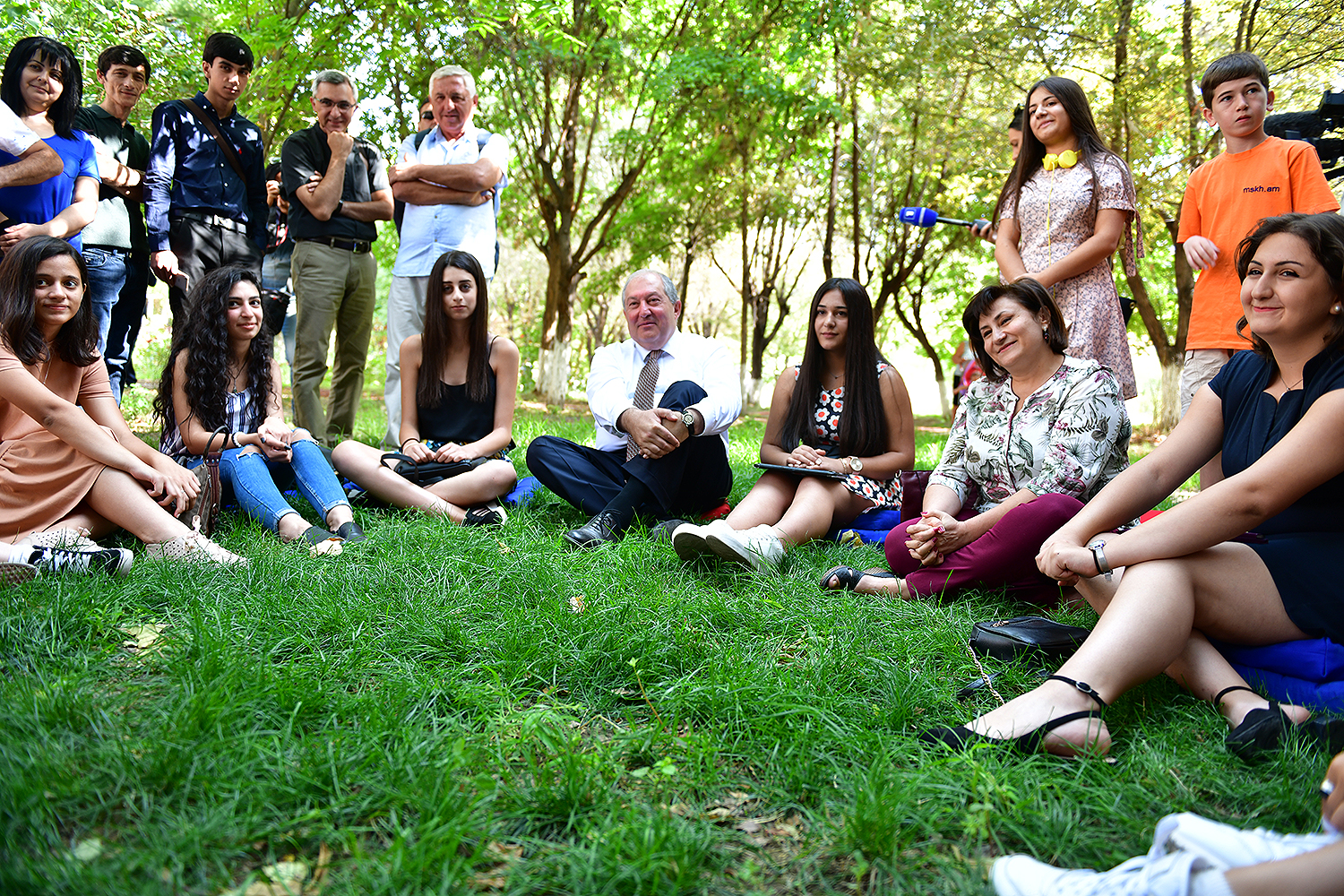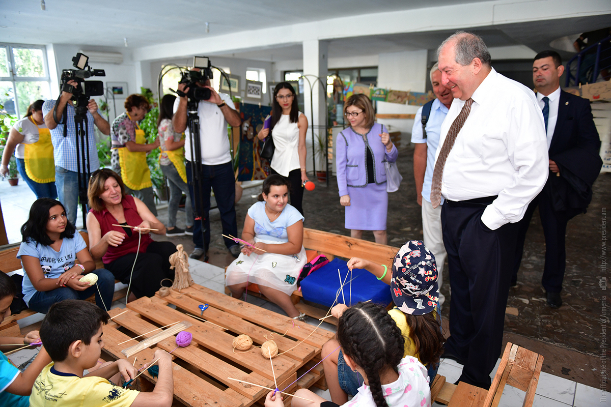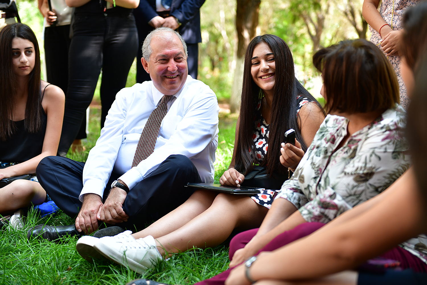 Армен Саркисян побеседовал с участвующими в рабочем семинаре по современным формам образования, инклюзивному образованию и защите прав ребёнка учителями, которые представляют столичные и областные школы. Президент также присутствовал на преподаваемом школьникам специальном уроке «Первая медицинская помощь».