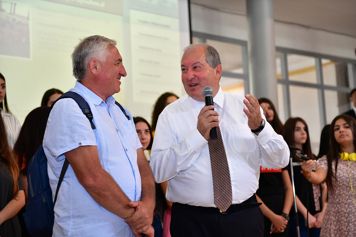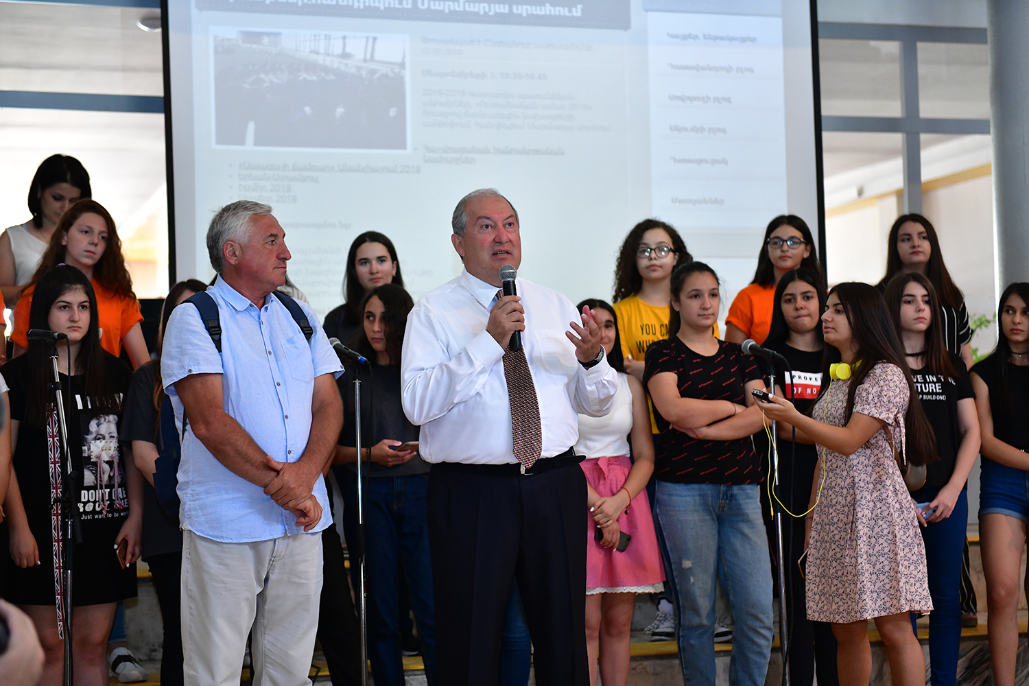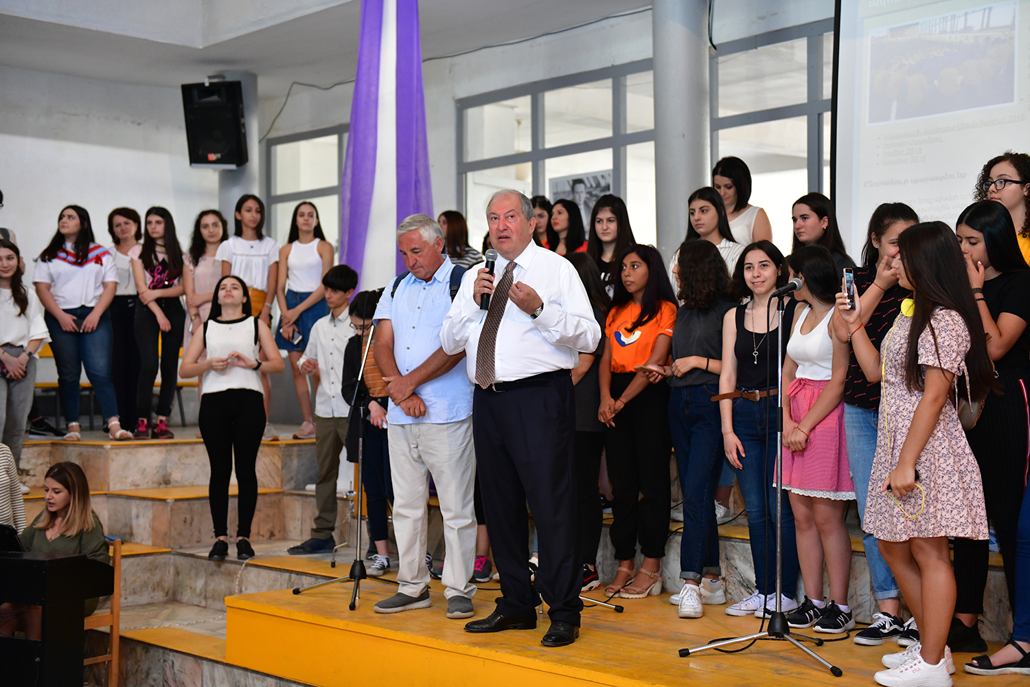 В основном корпусе образовательного комплекса, поздравив учеников, президент Армен Саркисян отметил: «Ваша школа – блестящий пример того, что если каждый из вас действительно во что-то верит, если каждый из вас имеет план, видение и готов посвятить свою жизнь, время, энергию для того, чтобы воплотить это видение в реальность, то однажды из ничего создастся громадная школа, однажды даже при самых маленьких в мире материальных и физических возможностях, мы получим максимальное».