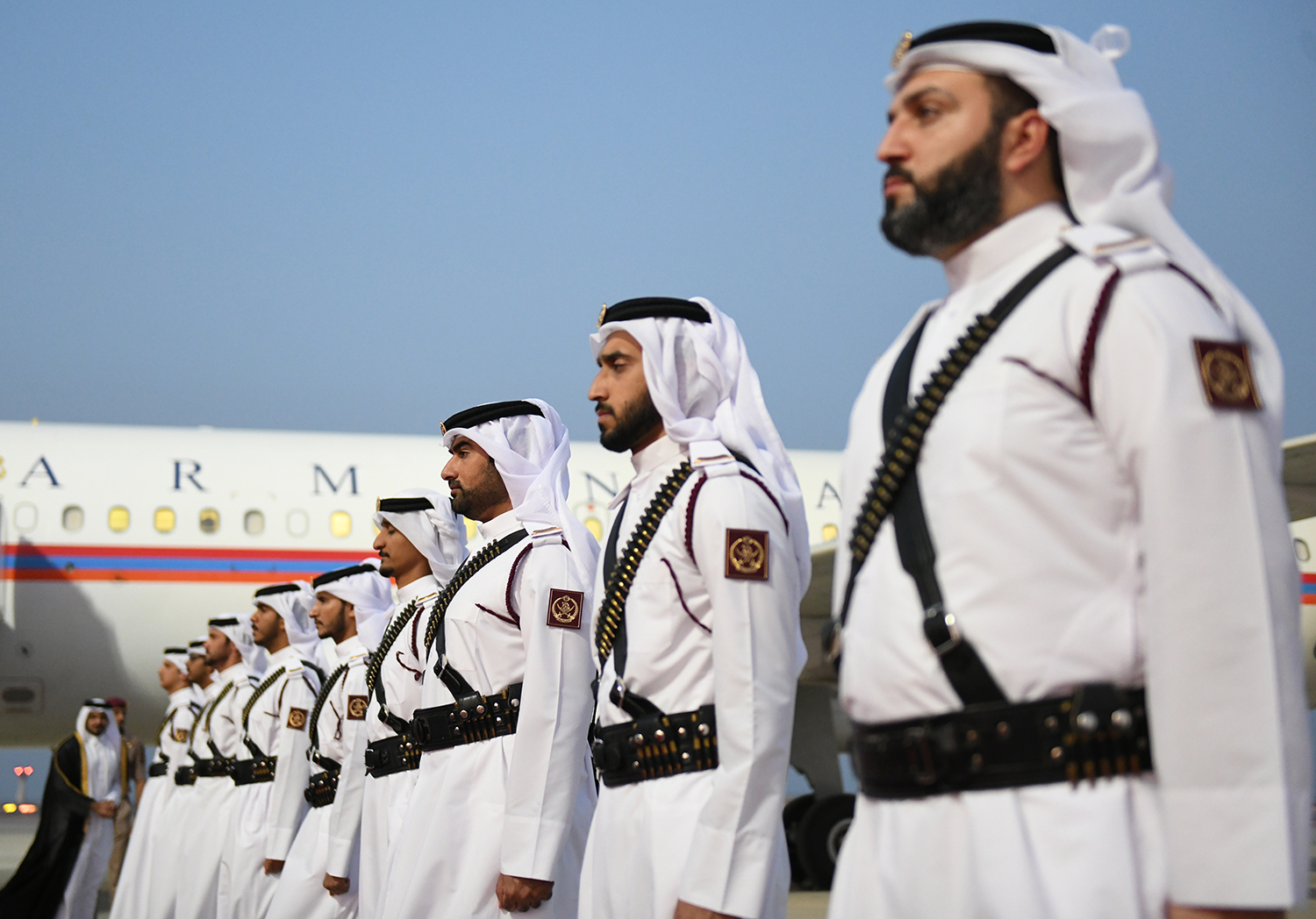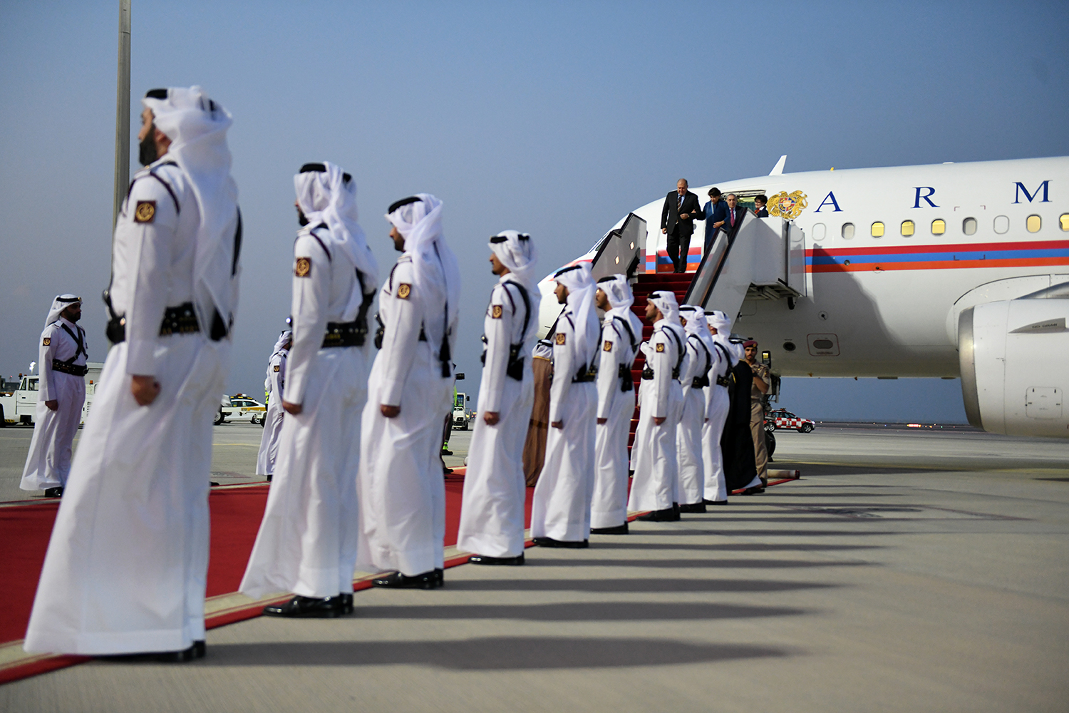 В международном аэропорту Дохи «Хамад» были подняты государственные флаги Республики Армения и Государства Катар, выстроен почётный караул.