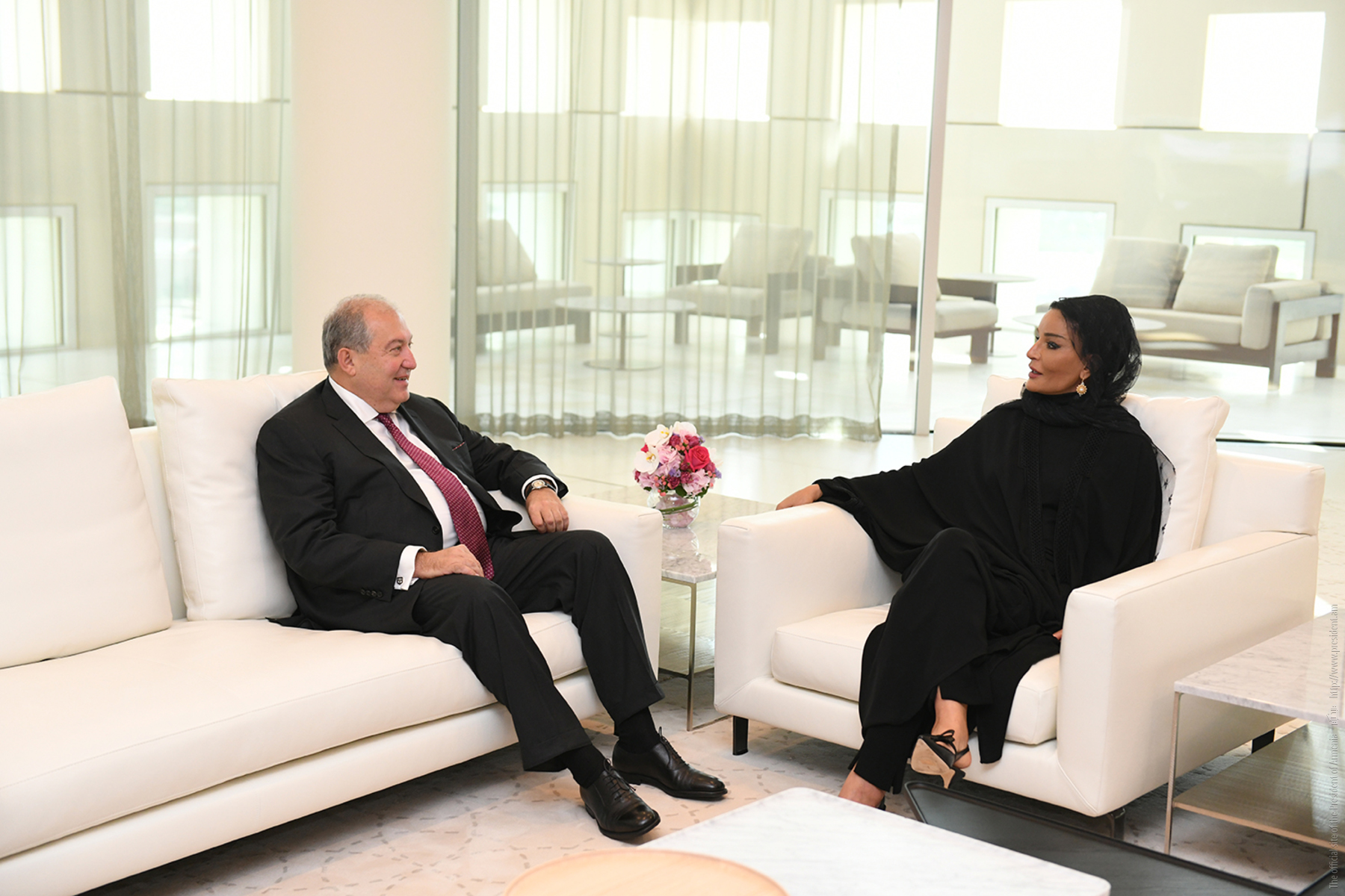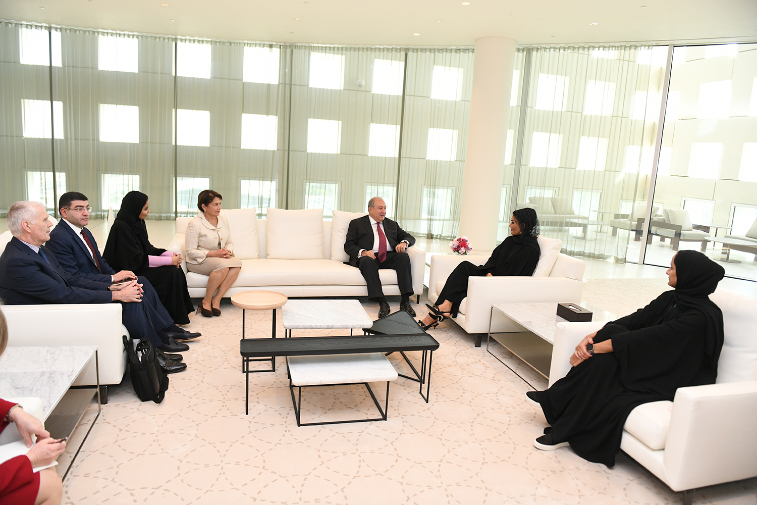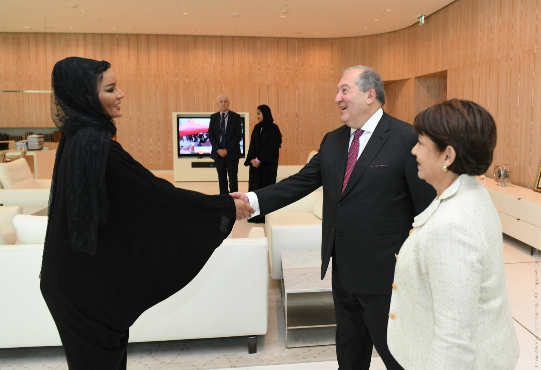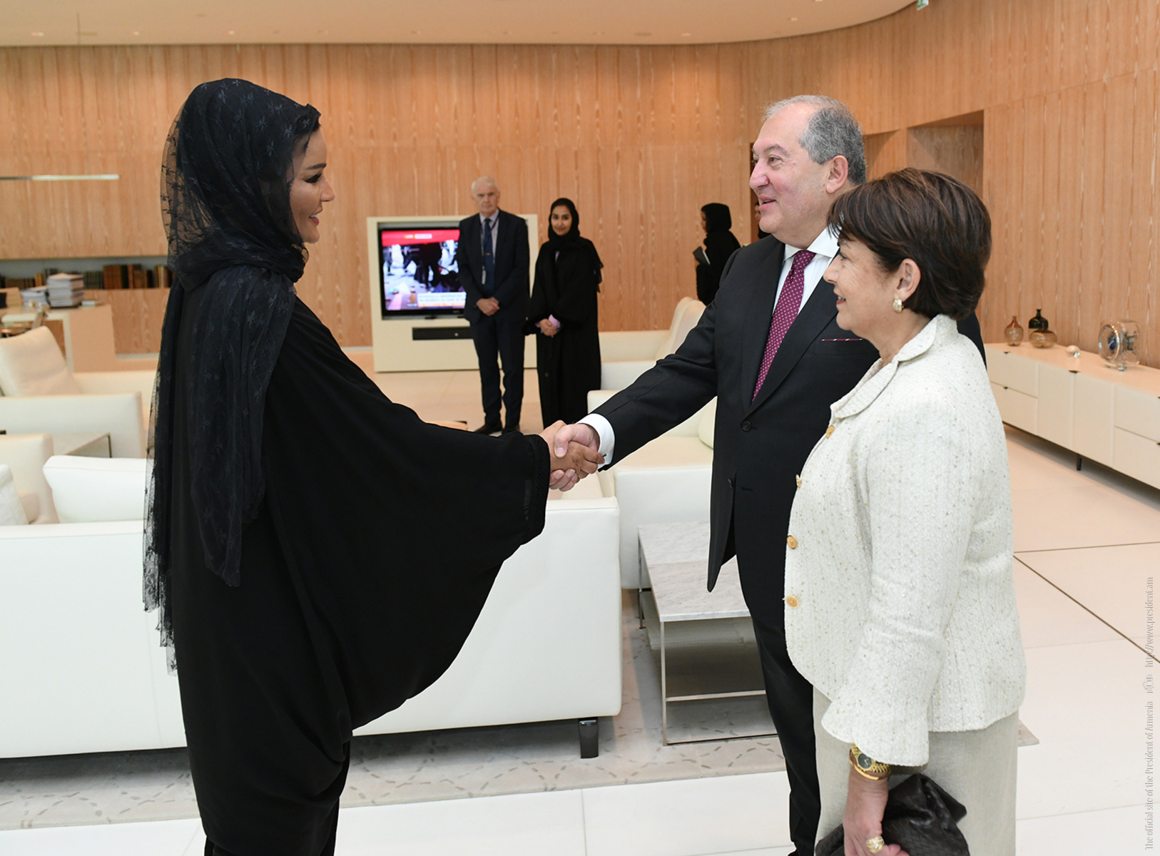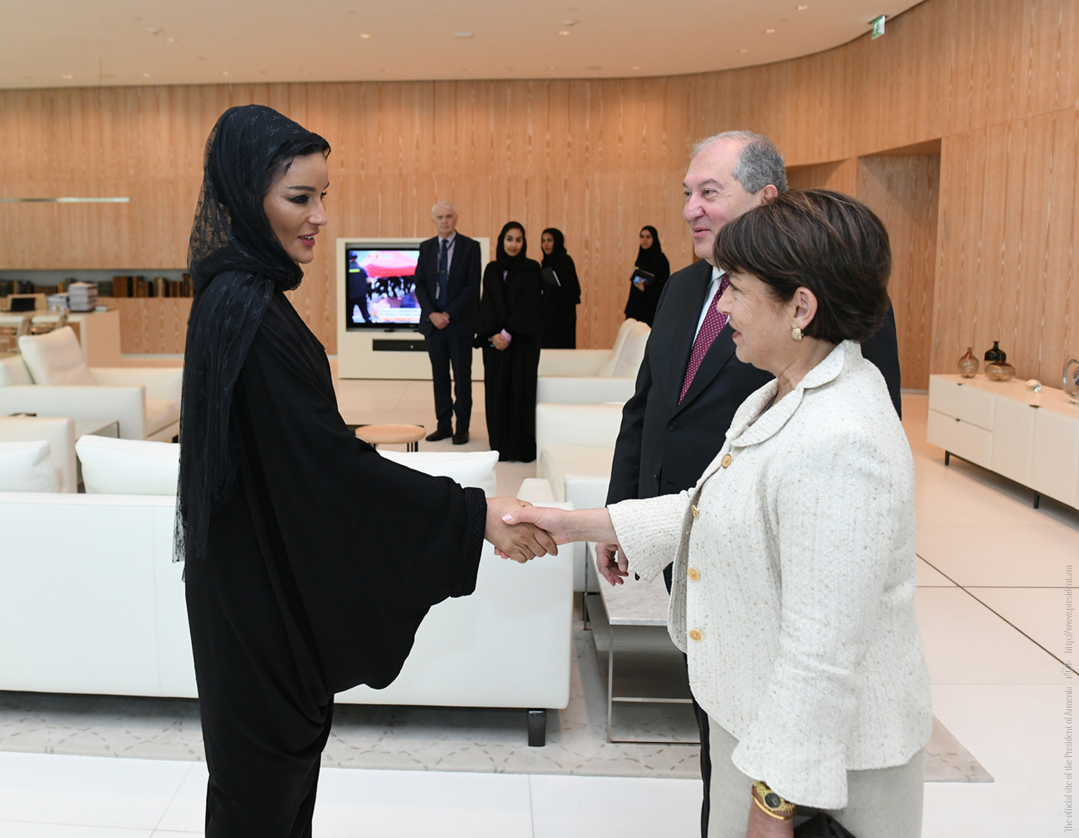 После экскурсии по зданию фонда, Президент Саркисян встретился с его руководителем и учредителем Шейхой Мозой бинт Насер аль- Миснед. Последняя представила Президенту Саркисяну реализуемые фондом образовательные, научные проекты и выразила Президенту Армении благодарность за участие в открытии инициированного фондом Всемирного информационного саммита образования.