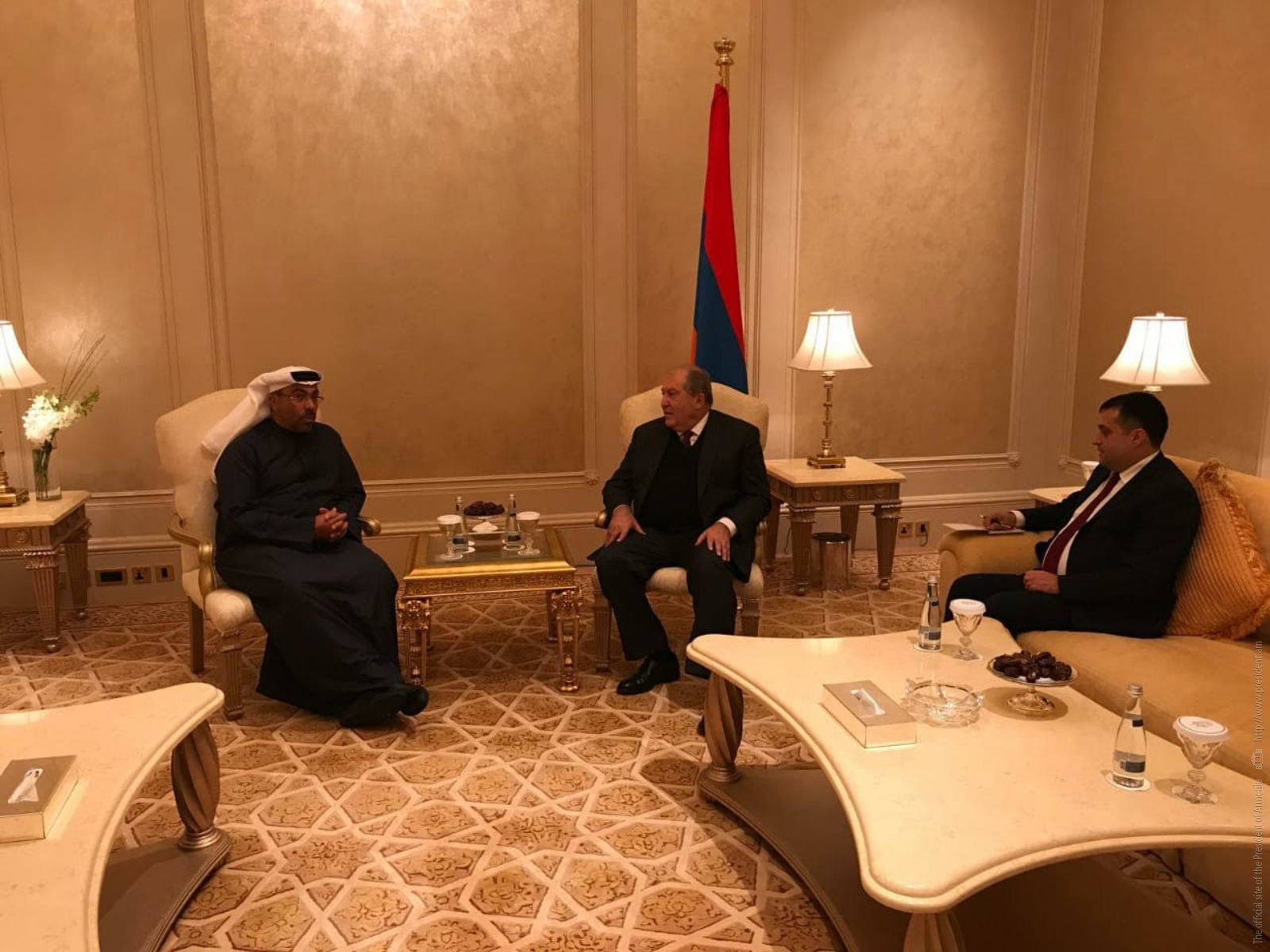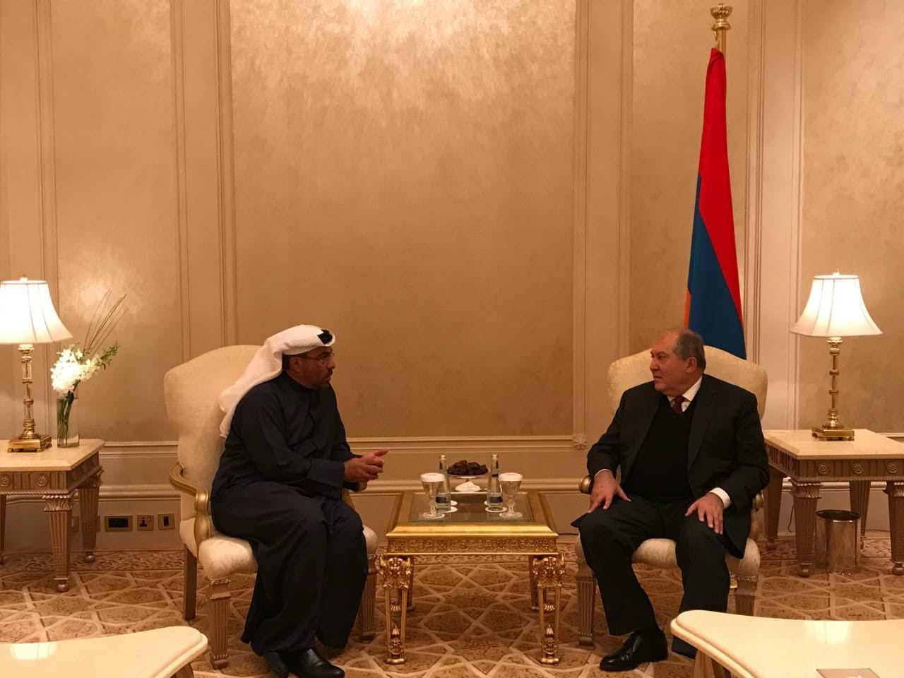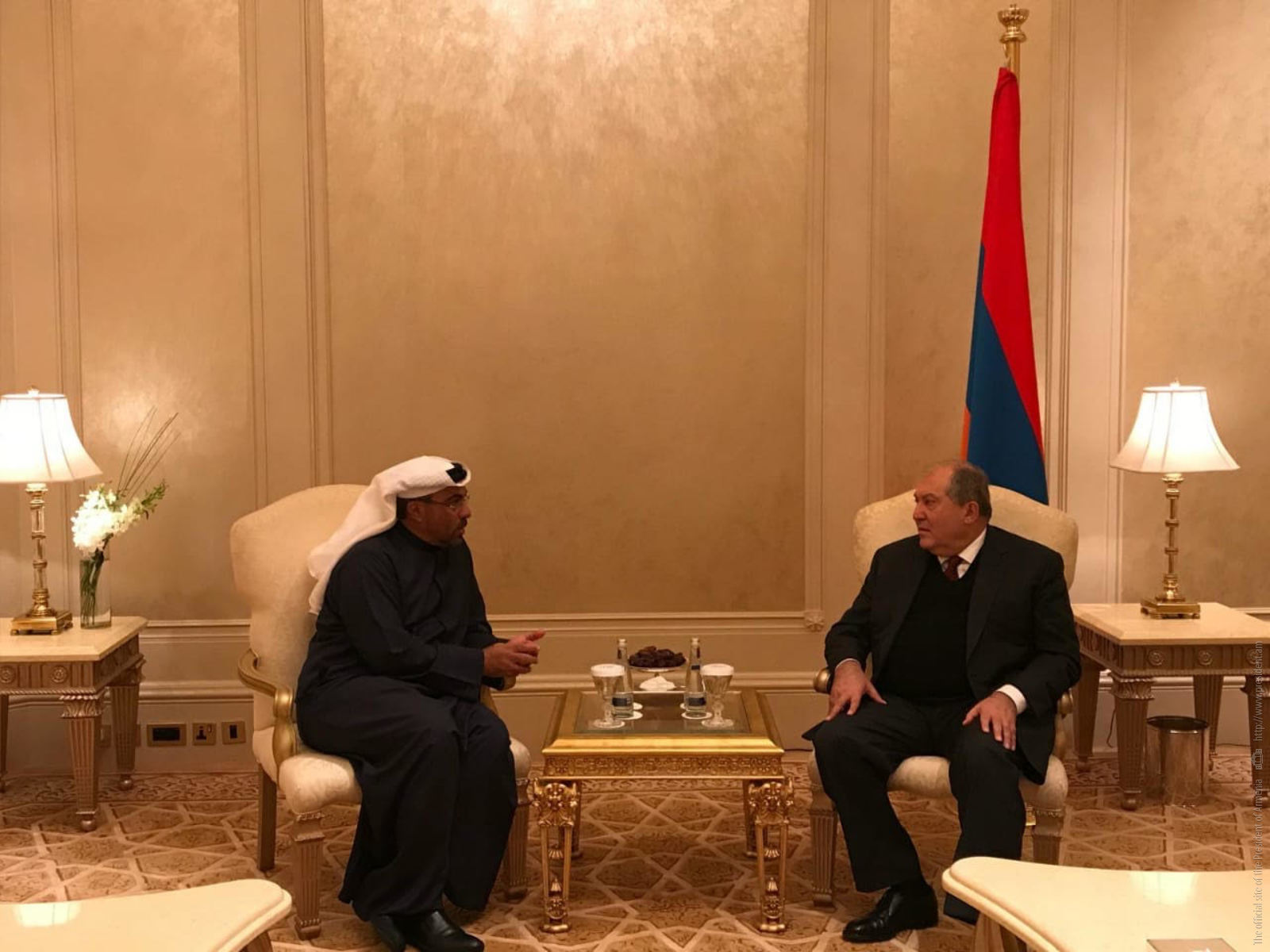 В рамках рабочего визита в Объединённые Арабские Эмираты Президент Республики Армения Армен Саркисян в Абу-Даби встретился с сопредседателем со стороны ОАЭ Межправительственной армяно-эмиратской комиссии Ахмадом Али Аль-Саехом.