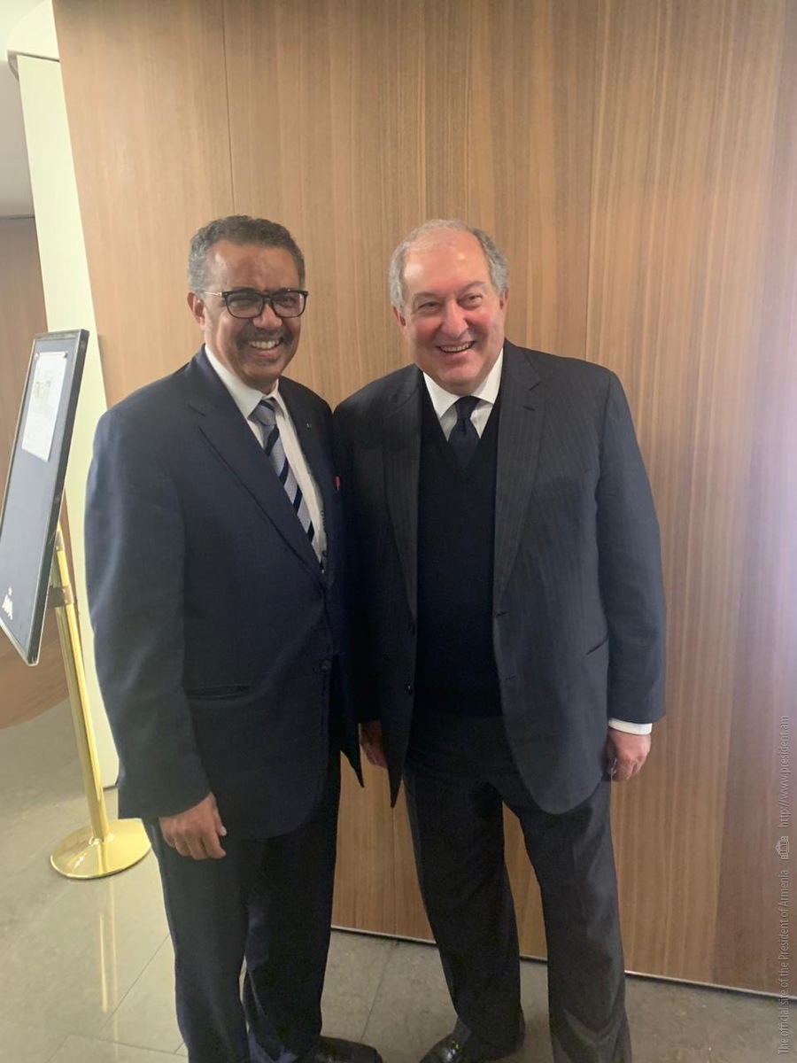 Находящийся с рабочим визитом в Мюнхене Президент Республики Армения Армен Саркисян встретился с Генеральным директором Всемирной организации здравоохранения Тедросом Адханомом Гебреисусом.