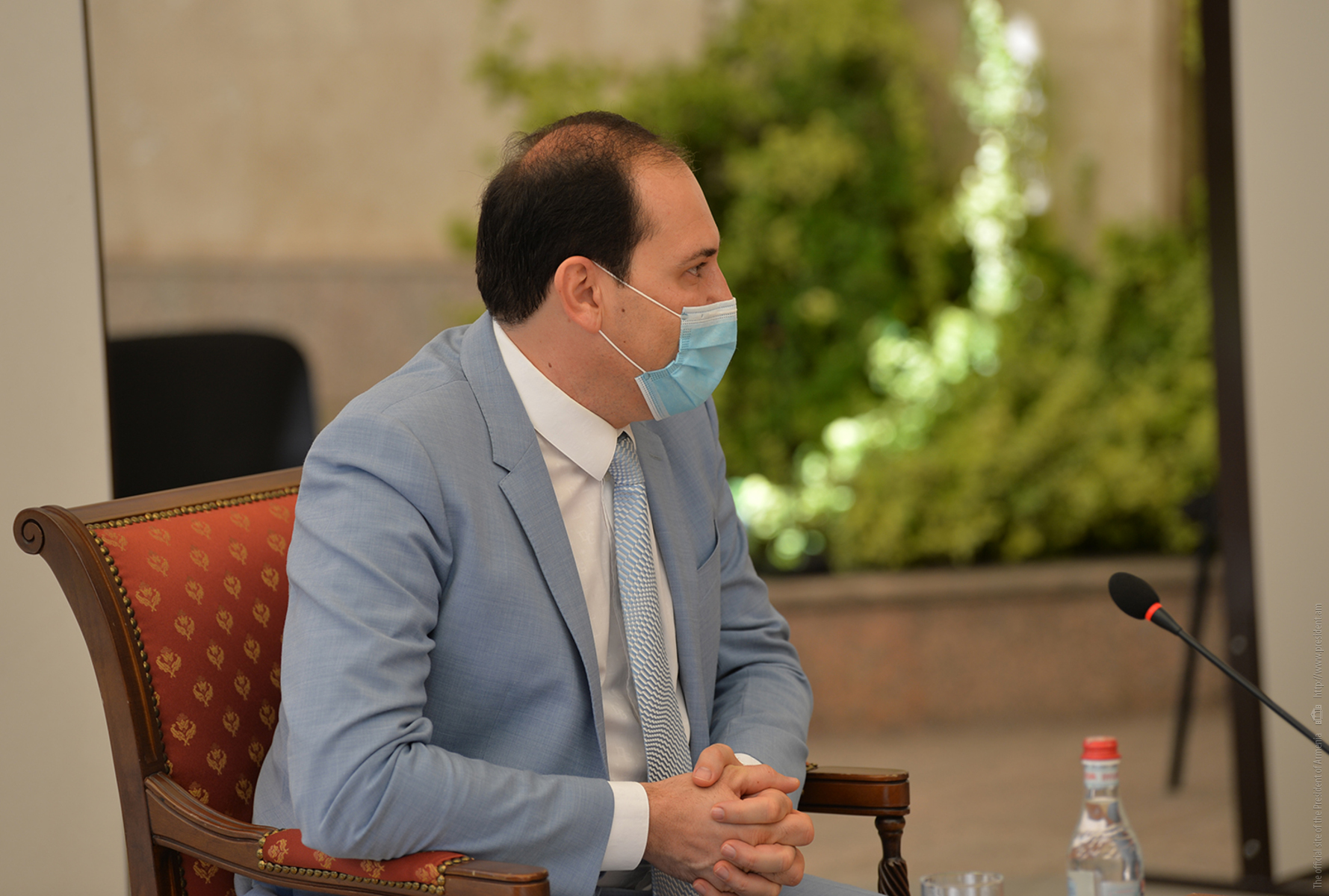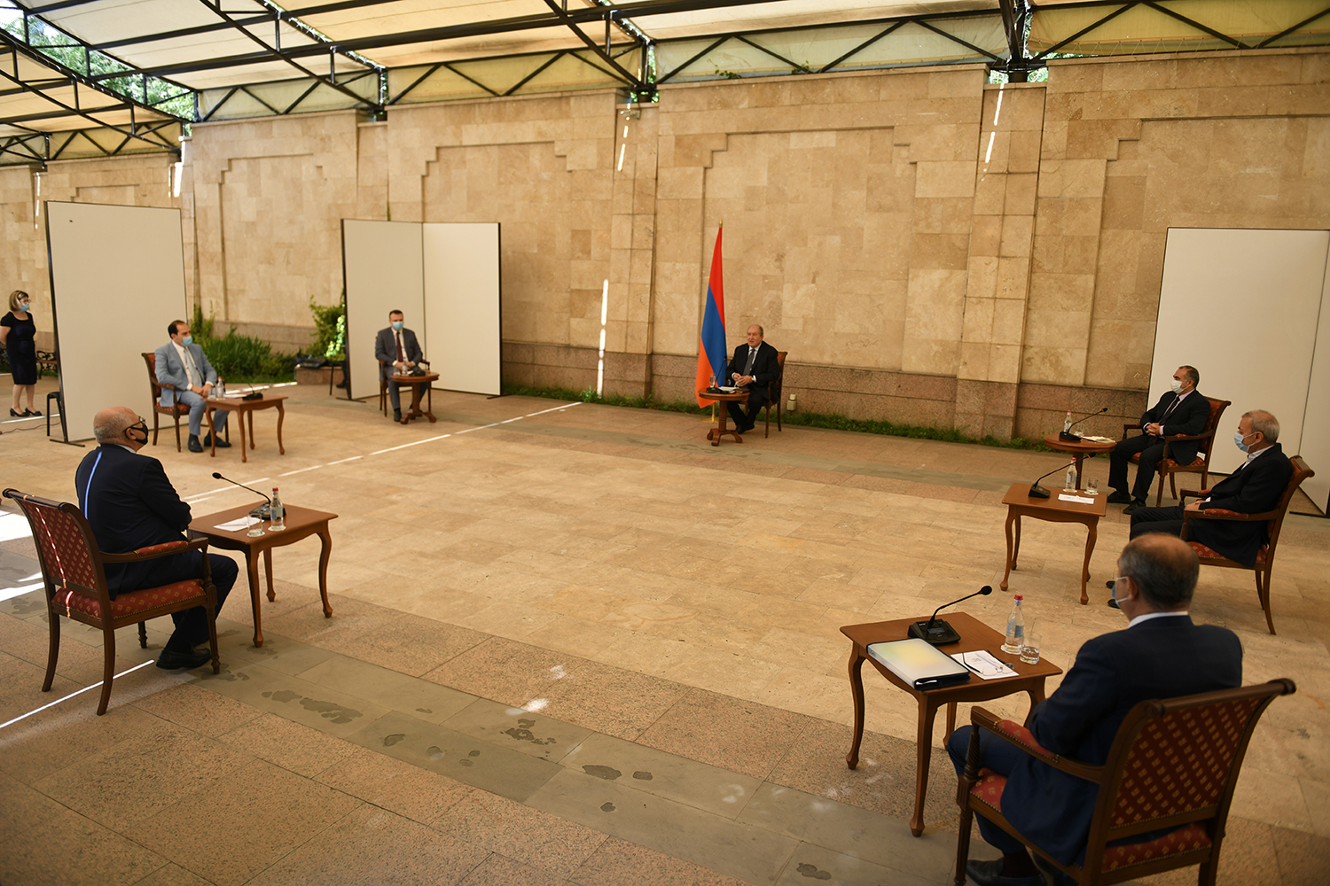 Президент Республики Армен Саркисян сегодня встретился с группой предпринимателей – членов Президиума Союза промышленников и предпринимателей Армении, чтобы обсудить возникшие в экономической сфере вследствие пандемии трудности и проблемы, пути их решения, возможности помощи предпринимателям, способы развития. Во встрече приняли участие Президент Союза промышленников и предпринимателей Армении Арсен Казарян, члены Президиума Норайр Хачатрян (ООО «ИМЭКС ГРУП»), Армен Мкоян (ЗАО «ЭЛИТ ГРУПП»), Ваагн Мкртчян ("АРМЕНИЯ ВАЙН" ЗАВОД ООО), Армен Тер-Тачатян ("ТЕР-ТАЧАТЯН" юридическое и бизнес-консалтинговое ЗАО).